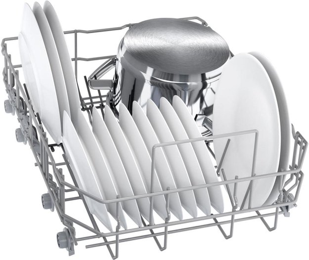 Как правило, полки для столовых приборов находятся в верхней корзине — таким образом, чтобы под ними можно было расположить, например, небольшие чашки. Часто полки оснащаются специальными разделителями, которые позволяют зафиксировать любой предмет, чтобы он не мог случайно сдвинуться с перекрыть доступ к соседним. В ряде моделей для столовых приборов предусматриваются большие полки, которые размещаются на третьем уровне. Такая конструкция считается оптимальной, так как освобождается место в корзинах для более крупных предметов. Такие полки достигают в высоту 5 см, так что на них можно размещать не только обычные ножи, ложки или вилки, но и более объемные половники, шумовки, лопатки, терки и другую подобную утварь.