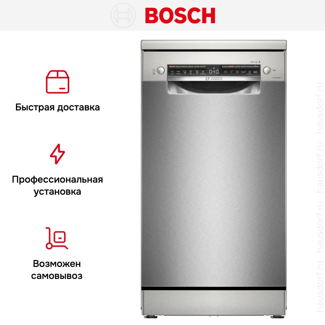 Отдельностоящая модель Бош отлично впишется в кухонный интерьер, главное — правильно выбрать место, чтобы подвести коммуникации. Имеет уменьшенную ширину — благодаря этому поместится даже на очень маленькой кухне. В камеру можно загрузить ограниченное число комплектов: 10 шт. Комплектом считается набор посуды на одного человека, который нужен для полноценного приема пищи: глубокая и плоская тарелки, тарелка для салата, блюдце под чашку, сама чашка, ложка и вилка.