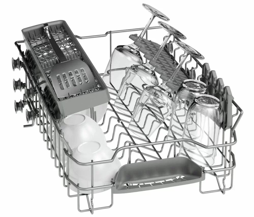 В другом варианте столовые приборы помещаются в съемную корзину, а для ножей предусматривается отдельная полочка. Большое количество ярко окрашенных складных элементов, стоек, держателей и полок позволяет разместить всю посуду компактно и в то же время обеспечить лучшее качество мойки. Система защиты стекла позволяет установить тонкие стаканы, фужеры и бокалы, защищая их от повреждений.
