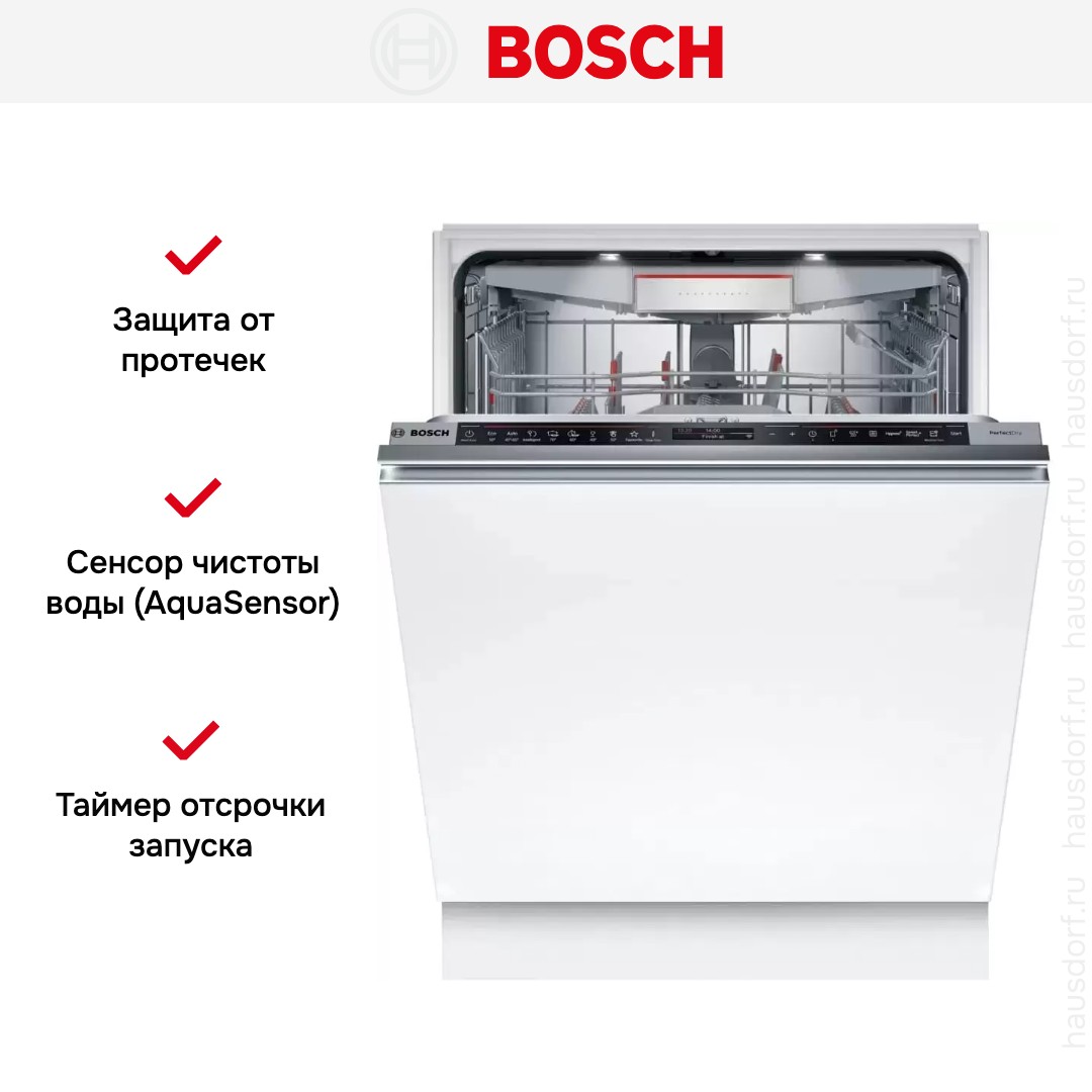 Встраиваемая модель Бош отлично впишется в любой интерьер, главное — правильно выбрать место, чтобы подвести коммуникации. Устанавливается в нишу целиком, полностью закрывается декоративной панелью. Обратите внимание: в комплекте не идет фасад, его необходимо установить самостоятельно. Имеет стандартные размеры, поэтому может не поместиться на очень маленькой кухне. В камеру можно загрузить ограниченное число комплектов: 14 шт. Комплектом считается набор посуды на одного человека, который нужен для полноценного приема пищи: глубокая и плоская тарелки, тарелка для салата, блюдце под чашку, сама чашка, ложка и вилка.