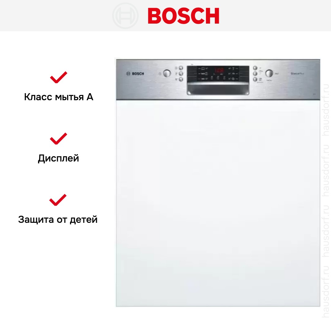 Встраиваемая модель Бош отлично впишется в любой интерьер, главное — правильно выбрать место, чтобы подвести коммуникации. Устанавливается в нишу неполностью, остается открытой панель управления. Имеет стандартные размеры, поэтому может не поместиться на очень маленькой кухне. В камеру можно загрузить ограниченное число комплектов: 13 шт. Комплектом считается набор посуды на одного человека, который нужен для полноценного приема пищи: глубокая и плоская тарелки, тарелка для салата, блюдце под чашку, сама чашка, ложка и вилка.