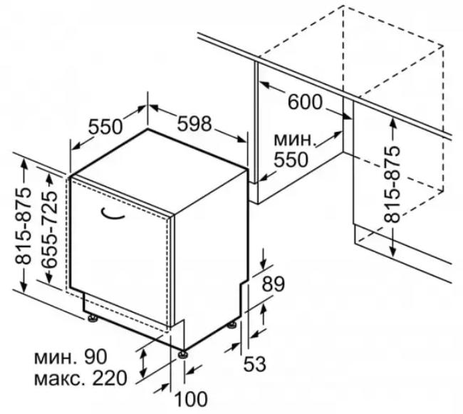 Встраиваемая модель Бош отлично впишется в любой интерьер, главное — правильно выбрать место, чтобы подвести коммуникации. Устанавливается в нишу целиком, полностью закрывается декоративной панелью. Обратите внимание: в комплекте не идет фасад, его необходимо установить самостоятельно. Имеет стандартные размеры, поэтому может не поместиться на очень маленькой кухне. В камеру можно загрузить ограниченное число комплектов: 12 шт. Комплектом считается набор посуды на одного человека, который нужен для полноценного приема пищи: глубокая и плоская тарелки, тарелка для салата, блюдце под чашку, сама чашка, ложка и вилка.