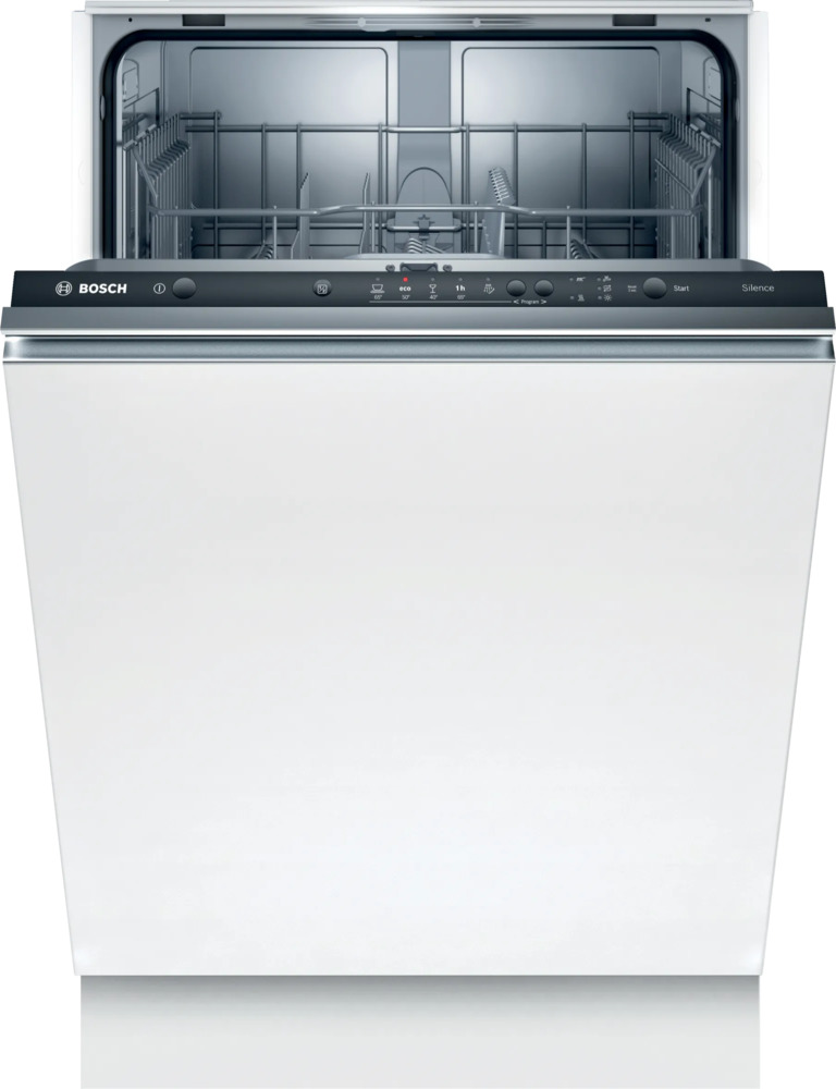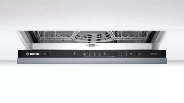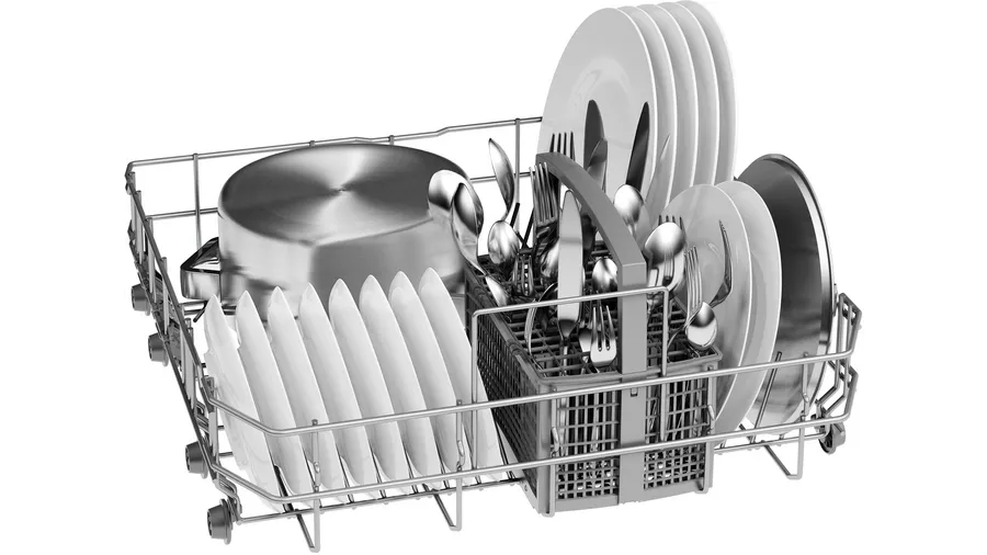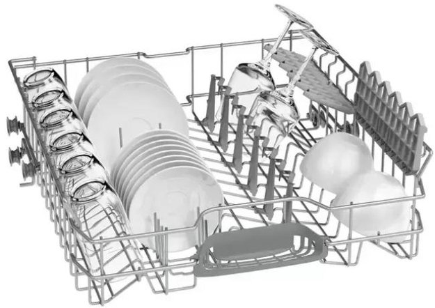 Встраиваемая модель Бош отлично впишется в любой интерьер, главное — правильно выбрать место, чтобы подвести коммуникации. Устанавливается в нишу целиком, полностью закрывается декоративной панелью. Обратите внимание: в комплекте не идет фасад, его необходимо установить самостоятельно. Имеет стандартные размеры, поэтому может не поместиться на очень маленькой кухне. В камеру можно загрузить ограниченное число комплектов: 12 шт. Комплектом считается набор посуды на одного человека, который нужен для полноценного приема пищи: глубокая и плоская тарелки, тарелка для салата, блюдце под чашку, сама чашка, ложка и вилка.