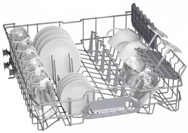 Встраиваемая модель Бош отлично впишется в любой интерьер, главное — правильно выбрать место, чтобы подвести коммуникации. Устанавливается в нишу целиком, полностью закрывается декоративной панелью. Обратите внимание: в комплекте не идет фасад, его необходимо установить самостоятельно. Имеет стандартные размеры, поэтому может не поместиться на очень маленькой кухне. В камеру можно загрузить ограниченное число комплектов: 12 шт. Комплектом считается набор посуды на одного человека, который нужен для полноценного приема пищи: глубокая и плоская тарелки, тарелка для салата, блюдце под чашку, сама чашка, ложка и вилка.