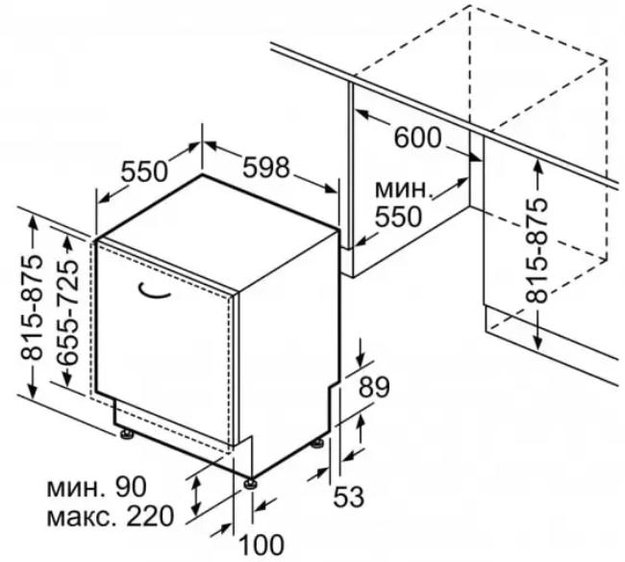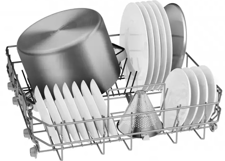 Встраиваемая модель Бош отлично впишется в любой интерьер, главное — правильно выбрать место, чтобы подвести коммуникации. Устанавливается в нишу целиком, полностью закрывается декоративной панелью. Обратите внимание: в комплекте не идет фасад, его необходимо установить самостоятельно. Имеет стандартные размеры, поэтому может не поместиться на очень маленькой кухне. В камеру можно загрузить ограниченное число комплектов. Комплектом считается набор посуды на одного человека, который нужен для полноценного приема пищи: глубокая и плоская тарелки, тарелка для салата, блюдце под чашку, сама чашка, ложка и вилка.
