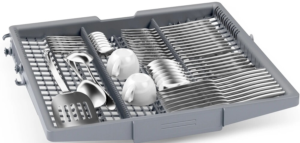 Встраиваемая модель Бош отлично впишется в любой интерьер, главное — правильно выбрать место, чтобы подвести коммуникации. Устанавливается в нишу целиком, полностью закрывается декоративной панелью. Обратите внимание: в комплекте не идет фасад, его необходимо установить самостоятельно. Имеет стандартные размеры, поэтому может не поместиться на очень маленькой кухне. В камеру можно загрузить ограниченное число комплектов: 14 шт. Комплектом считается набор посуды на одного человека, который нужен для полноценного приема пищи: глубокая и плоская тарелки, тарелка для салата, блюдце под чашку, сама чашка, ложка и вилка.