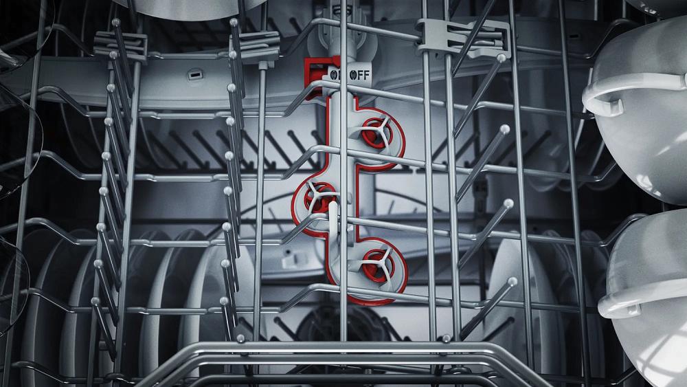 Как известно, принцип работы посудомоечной машины состоит в том, что на посуду в корзинах воздействуют сильные струи воды, которые подаются сквозь специальные форсунки во вращающихся разбрызгивателях-коромыслах. Класс мытья определяется, исходя из количества разбрызгивателей и форсунок, а также их диаметра — чем больше отверстий и чем меньше их диаметр, тем выше класс. Имеет значение также и расположение отверстий, так как струи воды не должны пересекаться — это мешает точности попадания в нужные места, а значит, и эффективности мытья. Кроме того, в камере не должно оставаться «слепых» зон, куда вода попадать не будет.