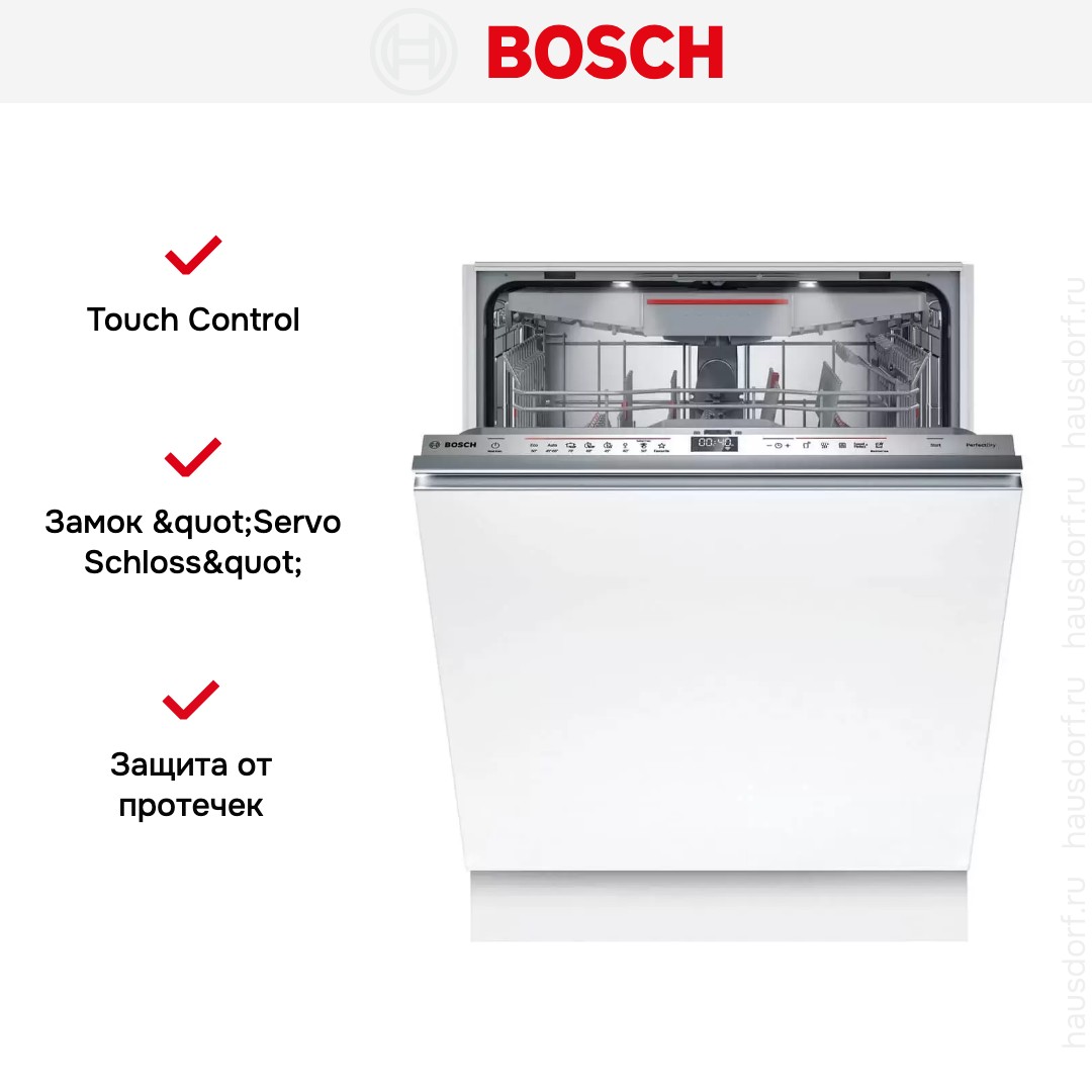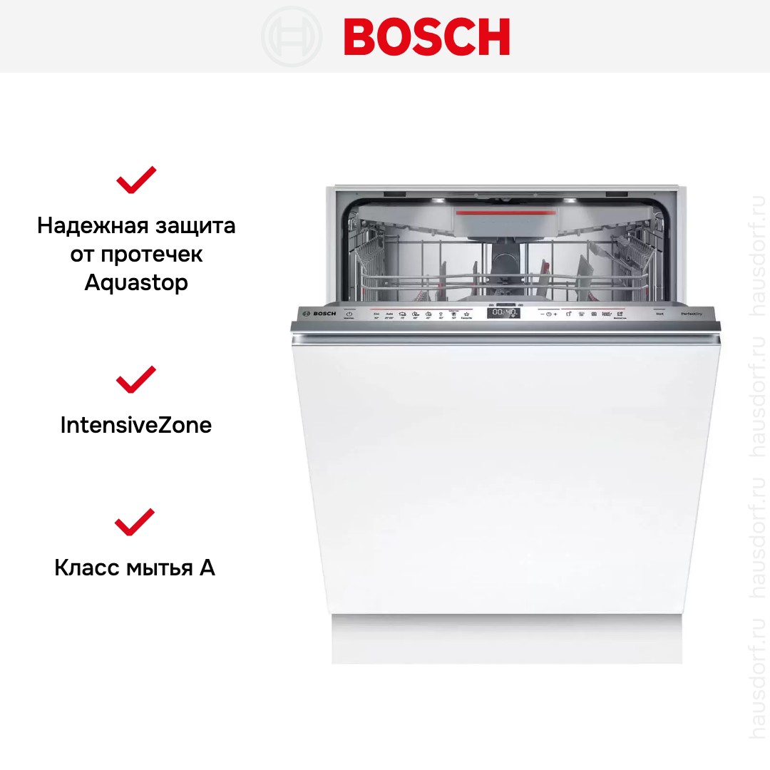 Встраиваемая модель Бош отлично впишется в любой интерьер, главное — правильно выбрать место, чтобы подвести коммуникации. Устанавливается в нишу целиком, полностью закрывается декоративной панелью. Обратите внимание: в комплекте не идет фасад, его необходимо установить самостоятельно. Имеет стандартные размеры, поэтому может не поместиться на очень маленькой кухне. В камеру можно загрузить ограниченное число комплектов: 14 шт. Комплектом считается набор посуды на одного человека, который нужен для полноценного приема пищи: глубокая и плоская тарелки, тарелка для салата, блюдце под чашку, сама чашка, ложка и вилка.