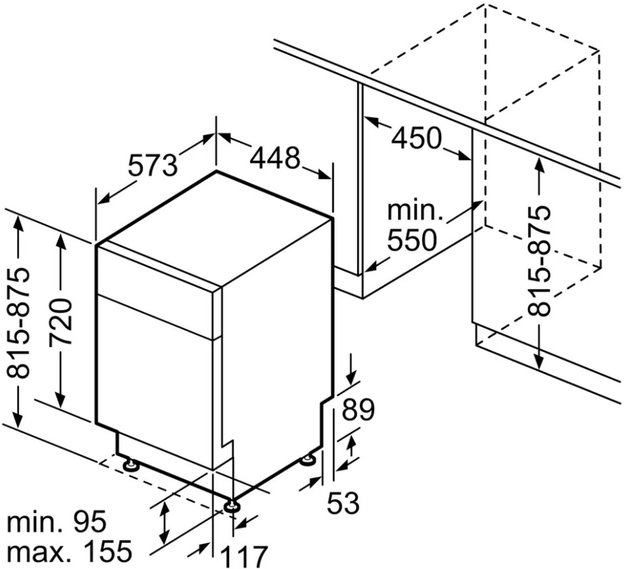 Большая часть полноразмерных и узких посудомоек встраиваемого и отдельностоящего вида имеет высоту около 82-85 см: такие модели легко размещаются под столешницей. Встраиваемые модели несколько ниже, так как у них отсутствует верхняя крышка.