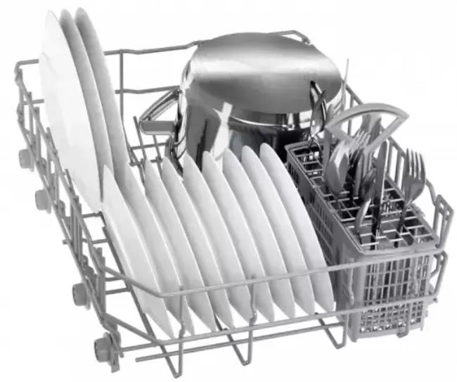 Встраиваемая модель Бош отлично впишется в любой интерьер, главное — правильно выбрать место, чтобы подвести коммуникации. Устанавливается в нишу целиком, полностью закрывается декоративной панелью. Обратите внимание: в комплекте не идет фасад, его необходимо установить самостоятельно. Имеет уменьшенную ширину — благодаря этому поместится даже на очень маленькой кухне. В камеру можно загрузить ограниченное число комплектов: 9 шт. Комплектом считается набор посуды на одного человека, который нужен для полноценного приема пищи: глубокая и плоская тарелки, тарелка для салата, блюдце под чашку, сама чашка, ложка и вилка.