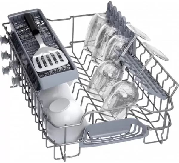 Встраиваемая модель Бош отлично впишется в любой интерьер, главное — правильно выбрать место, чтобы подвести коммуникации. Устанавливается в нишу целиком, полностью закрывается декоративной панелью. Обратите внимание: в комплекте не идет фасад, его необходимо установить самостоятельно. Имеет уменьшенную ширину — благодаря этому поместится даже на очень маленькой кухне. В камеру можно загрузить ограниченное число комплектов: 9 шт. Комплектом считается набор посуды на одного человека, который нужен для полноценного приема пищи: глубокая и плоская тарелки, тарелка для салата, блюдце под чашку, сама чашка, ложка и вилка.