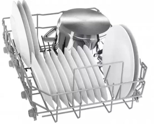 Встраиваемая модель Бош отлично впишется в любой интерьер, главное — правильно выбрать место, чтобы подвести коммуникации. Устанавливается в нишу целиком, полностью закрывается декоративной панелью. Обратите внимание: в комплекте не идет фасад, его необходимо установить самостоятельно. Имеет уменьшенную ширину — благодаря этому поместится даже на очень маленькой кухне. В камеру можно загрузить ограниченное число комплектов: 10 шт. Комплектом считается набор посуды на одного человека, который нужен для полноценного приема пищи: глубокая и плоская тарелки, тарелка для салата, блюдце под чашку, сама чашка, ложка и вилка.