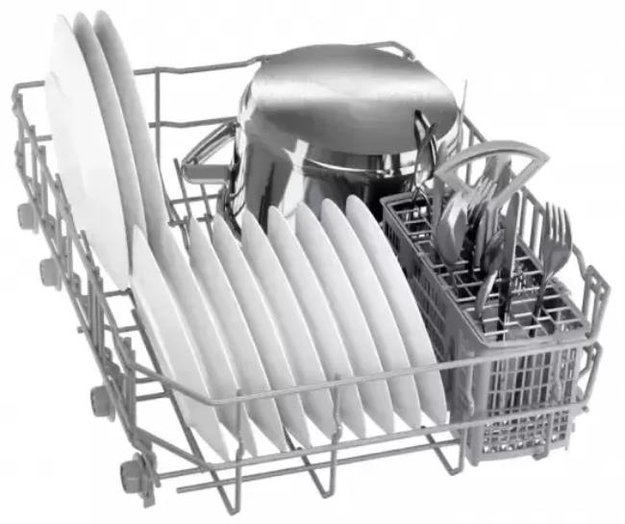 Встраиваемая модель Бош отлично впишется в любой интерьер, главное — правильно выбрать место, чтобы подвести коммуникации. Устанавливается в нишу целиком, полностью закрывается декоративной панелью. Обратите внимание: в комплекте не идет фасад, его необходимо установить самостоятельно. Имеет уменьшенную ширину — благодаря этому поместится даже на очень маленькой кухне. В камеру можно загрузить ограниченное число комплектов: 9 шт. Комплектом считается набор посуды на одного человека, который нужен для полноценного приема пищи: глубокая и плоская тарелки, тарелка для салата, блюдце под чашку, сама чашка, ложка и вилка.
