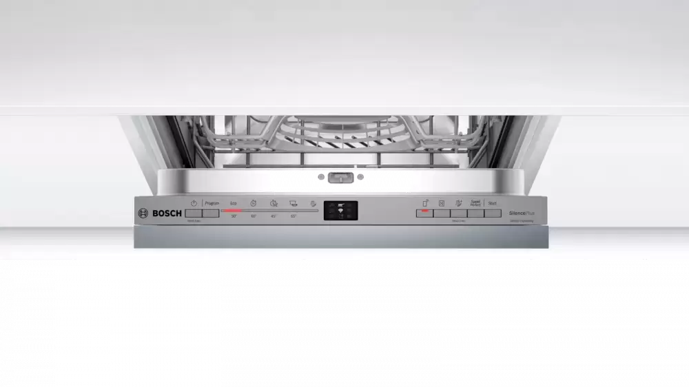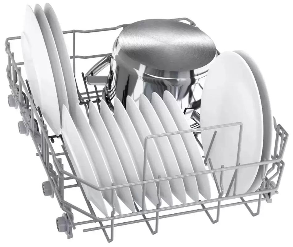 Встраиваемая модель Бош отлично впишется в любой интерьер, главное — правильно выбрать место, чтобы подвести коммуникации. Устанавливается в нишу целиком, полностью закрывается декоративной панелью. Обратите внимание: в комплекте не идет фасад, его необходимо установить самостоятельно. Имеет уменьшенную ширину — благодаря этому поместится даже на очень маленькой кухне. В камеру можно загрузить ограниченное число комплектов: 10 шт. Комплектом считается набор посуды на одного человека, который нужен для полноценного приема пищи: глубокая и плоская тарелки, тарелка для салата, блюдце под чашку, сама чашка, ложка и вилка.