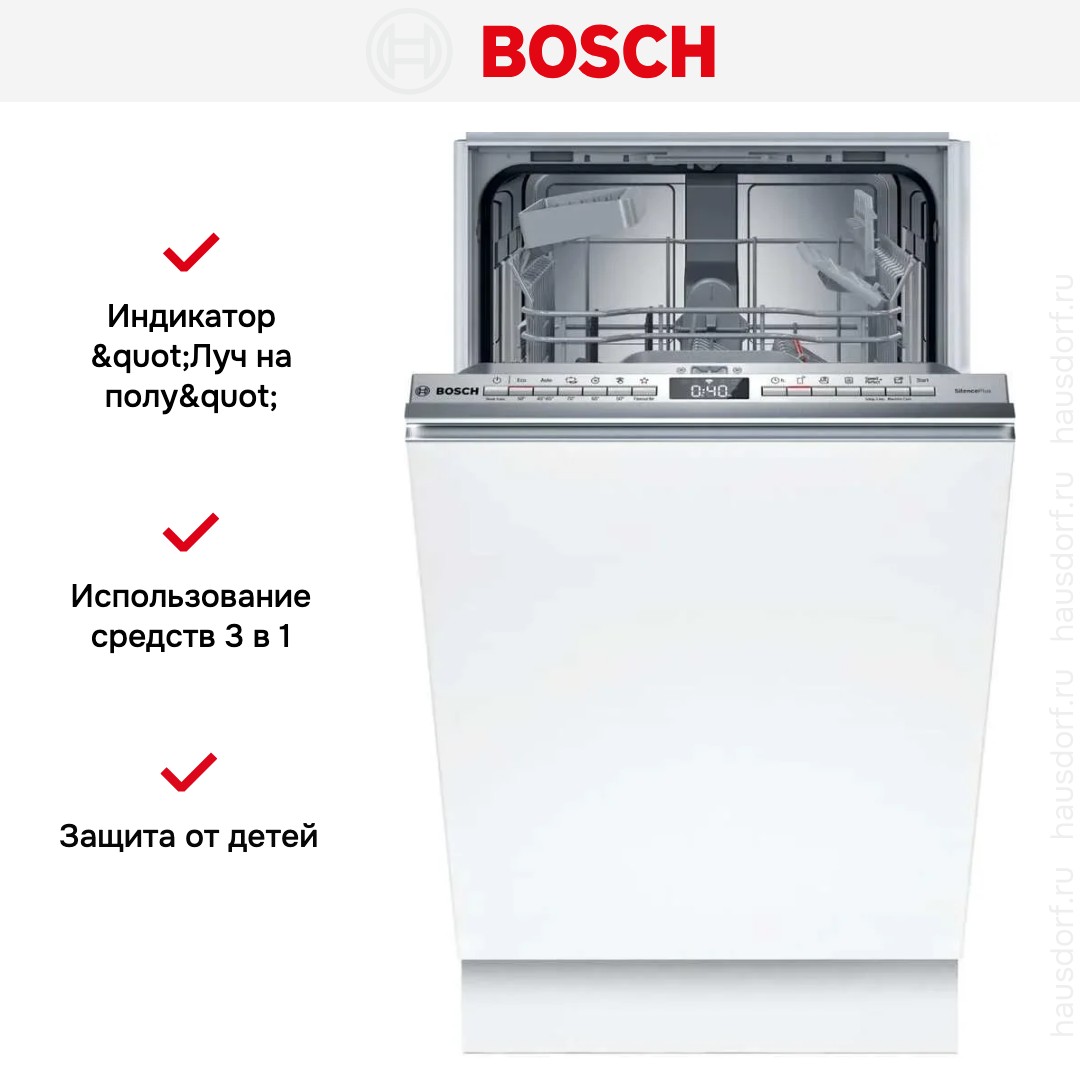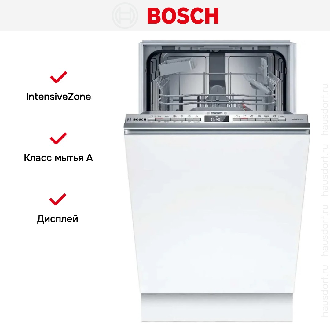 Встраиваемая посудомоечная машина Bosch SPV4EKX25E имеет узкий корпус и рассчитана на полную интеграцию под фасад вашей кухни. Элементы управления спрятаны в торце дверцы и незаметны в закрытом состоянии. Габариты 81.5×44.8×55 см обеспечивают комфортную установку даже в узкую нишу, а регулировка высоты до 87.5 см даёт свободу при размещении. Такой подход сохраняет единый стиль кухни и делает технику незаметной в интерьере.