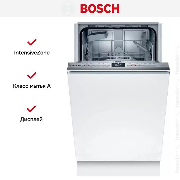 Встраиваемая модель Бош отлично впишется в любой интерьер, главное — правильно выбрать место, чтобы подвести коммуникации. Устанавливается в нишу целиком, полностью закрывается декоративной панелью. Обратите внимание: в комплекте не идет фасад, его необходимо установить самостоятельно. Имеет уменьшенную ширину — благодаря этому поместится даже на очень маленькой кухне. В камеру можно загрузить ограниченное число комплектов: 9 шт. Комплектом считается набор посуды на одного человека, который нужен для полноценного приема пищи: глубокая и плоская тарелки, тарелка для салата, блюдце под чашку, сама чашка, ложка и вилка.