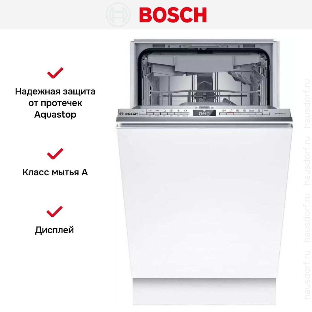 Посудомоечная машина Bosch SPV4EMX10E — встраиваемая узкая модель для полной интеграции в кухню, которая сочетает лаконичный дизайн с продуманной эргономикой. Высота корпуса 81,5 см и стандартная глубина 55 см делают устройство удобным для монтажа под стандартный навесный фасад. Панель управления прячется за дверцей и выполнена из нержавеющей стали, поэтому на лицевой стороне сохраняется ровная поверхность, а информация выводится на цифровой дисплей и через «луч на полу». Цвет корпуса подбирается под ваш фасад, что позволяет сохранить стиль кухонного гарнитура без лишних компромиссов.