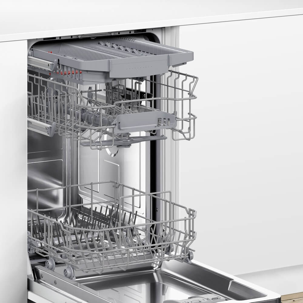 Встраиваемая модель Бош отлично впишется в любой интерьер, главное — правильно выбрать место, чтобы подвести коммуникации. Устанавливается в нишу целиком, полностью закрывается декоративной панелью. Обратите внимание: в комплекте не идет фасад, его необходимо установить самостоятельно. Имеет уменьшенную ширину — благодаря этому поместится даже на очень маленькой кухне. В камеру можно загрузить ограниченное число комплектов: 10 шт. Комплектом считается набор посуды на одного человека, который нужен для полноценного приема пищи: глубокая и плоская тарелки, тарелка для салата, блюдце под чашку, сама чашка, ложка и вилка.
