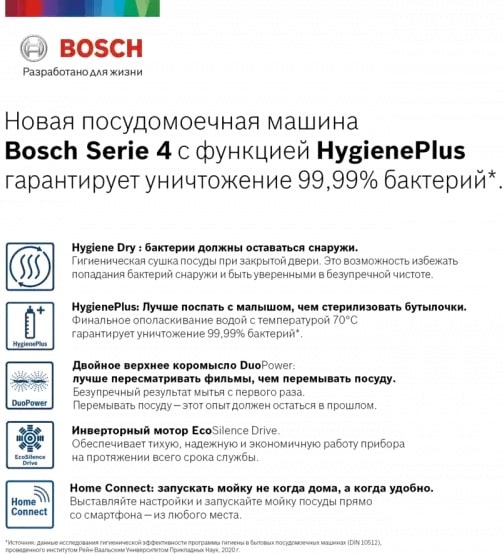 Система DuoPower в посудомоечных машинах Bosch служит для эффективного удаления любых, даже самых сильных загрязнений. Два вращающихся коромысла в верхней части камеры распыляют воду по всему пространству камеры, попадая в самые труднодоступные места, а потребление воды остается минимальным.