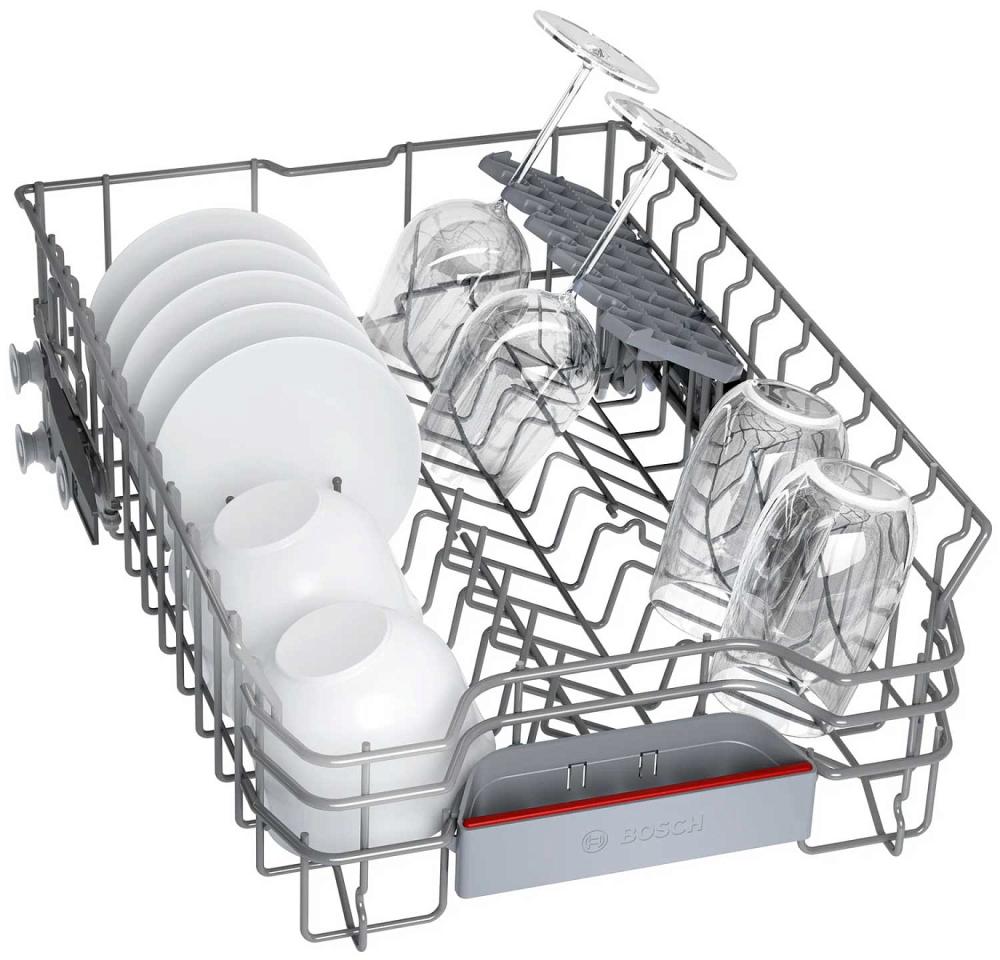 Встраиваемая модель Бош отлично впишется в любой интерьер, главное — правильно выбрать место, чтобы подвести коммуникации. Устанавливается в нишу целиком, полностью закрывается декоративной панелью. Обратите внимание: в комплекте не идет фасад, его необходимо установить самостоятельно. Имеет уменьшенную ширину — благодаря этому поместится даже на очень маленькой кухне. В камеру можно загрузить ограниченное число комплектов: 10 шт. Комплектом считается набор посуды на одного человека, который нужен для полноценного приема пищи: глубокая и плоская тарелки, тарелка для салата, блюдце под чашку, сама чашка, ложка и вилка.