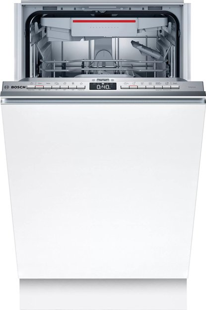Встраиваемая модель Бош отлично впишется в любой интерьер, главное — правильно выбрать место, чтобы подвести коммуникации. Устанавливается в нишу целиком, полностью закрывается декоративной панелью. Обратите внимание: в комплекте не идет фасад, его необходимо установить самостоятельно. Имеет уменьшенную ширину — благодаря этому поместится даже на очень маленькой кухне. В камеру можно загрузить ограниченное число комплектов: 9 шт. Комплектом считается набор посуды на одного человека, который нужен для полноценного приема пищи: глубокая и плоская тарелки, тарелка для салата, блюдце под чашку, сама чашка, ложка и вилка.