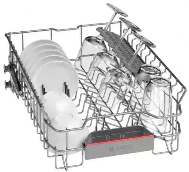 Встраиваемая модель Бош отлично впишется в любой интерьер, главное — правильно выбрать место, чтобы подвести коммуникации. Устанавливается в нишу целиком, полностью закрывается декоративной панелью. Обратите внимание: в комплекте не идет фасад, его необходимо установить самостоятельно. Имеет уменьшенную ширину — благодаря этому поместится даже на очень маленькой кухне. В камеру можно загрузить ограниченное число комплектов: 10 шт. Комплектом считается набор посуды на одного человека, который нужен для полноценного приема пищи: глубокая и плоская тарелки, тарелка для салата, блюдце под чашку, сама чашка, ложка и вилка.