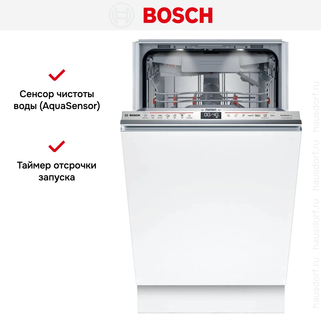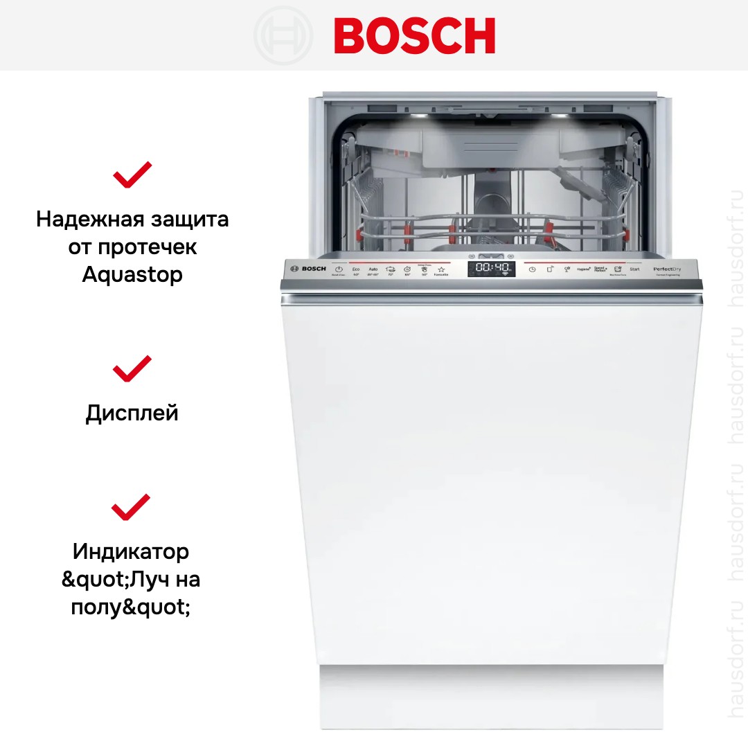 Встраиваемая модель Бош отлично впишется в любой интерьер, главное — правильно выбрать место, чтобы подвести коммуникации. Устанавливается в нишу целиком, полностью закрывается декоративной панелью. Обратите внимание: в комплекте не идет фасад, его необходимо установить самостоятельно. Имеет уменьшенную ширину — благодаря этому поместится даже на очень маленькой кухне. В камеру можно загрузить ограниченное число комплектов: 10 шт. Комплектом считается набор посуды на одного человека, который нужен для полноценного приема пищи: глубокая и плоская тарелки, тарелка для салата, блюдце под чашку, сама чашка, ложка и вилка.
