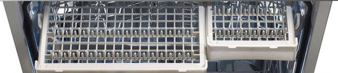 Для столовых приборов предусмотрен специальный лоток Mezzanine. Короб для посуды регулируется по высоте, что позволяет размещать тарелки большого диаметра, высокие бокалы и крупногабаритные кастрюли и противни.