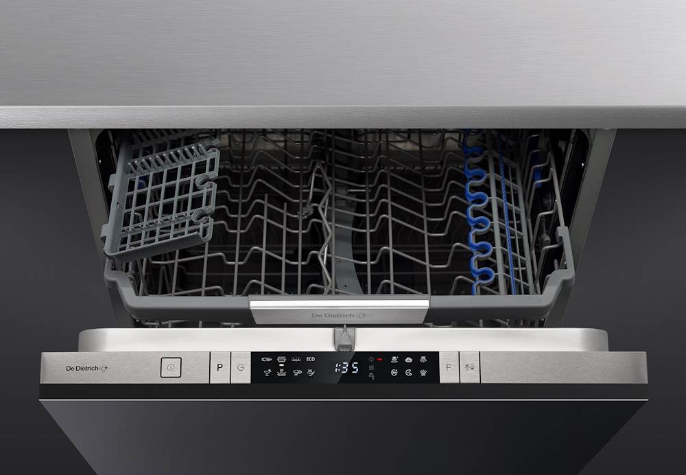 Встраиваемая модель Де Дитрих отлично впишется в любой интерьер, главное — правильно выбрать место, чтобы подвести коммуникации. Устанавливается в нишу целиком, полностью закрывается декоративной панелью. Обратите внимание: в комплекте не идет фасад, его необходимо установить самостоятельно. Имеет стандартные размеры, поэтому может не поместиться на очень маленькой кухне. В камеру можно загрузить ограниченное число комплектов: 14 шт. Комплектом считается набор посуды на одного человека, который нужен для полноценного приема пищи: глубокая и плоская тарелки, тарелка для салата, блюдце под чашку, сама чашка, ложка и вилка.