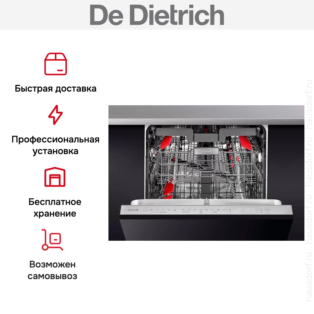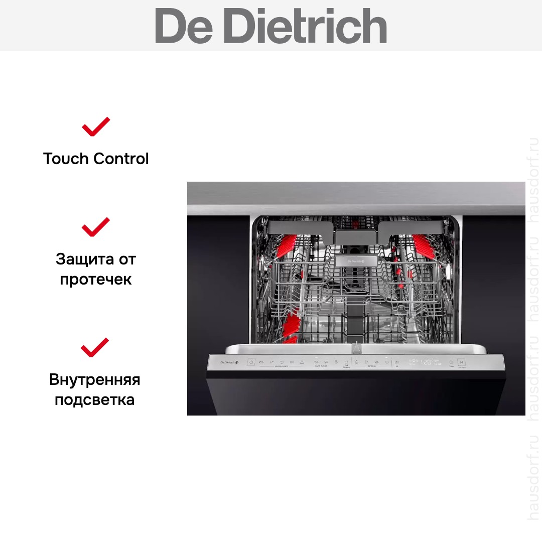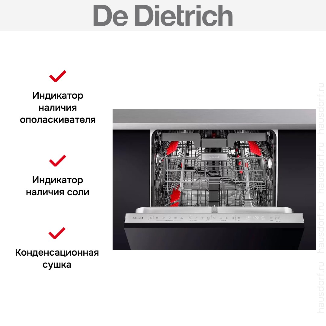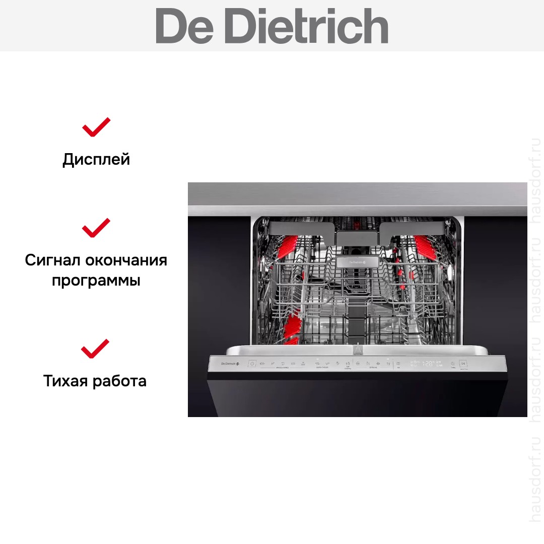 Встраиваемая модель Де Дитрих отлично впишется в любой интерьер, главное — правильно выбрать место, чтобы подвести коммуникации. Устанавливается в нишу целиком, полностью закрывается декоративной панелью. Обратите внимание: в комплекте не идет фасад, его необходимо установить самостоятельно. Имеет стандартные размеры, поэтому может не поместиться на очень маленькой кухне. В камеру можно загрузить ограниченное число комплектов: 16 шт. Комплектом считается набор посуды на одного человека, который нужен для полноценного приема пищи: глубокая и плоская тарелки, тарелка для салата, блюдце под чашку, сама чашка, ложка и вилка.