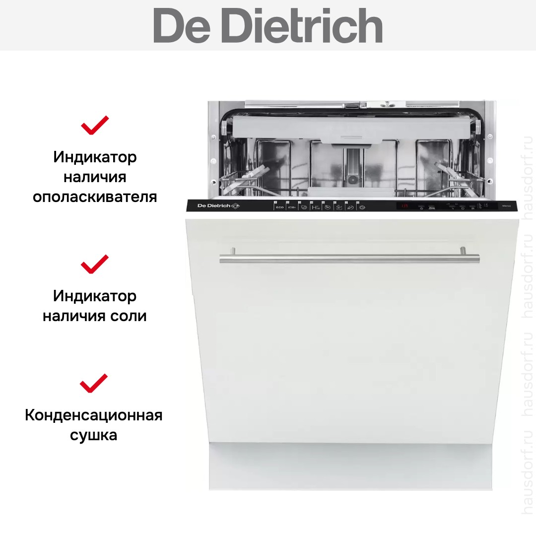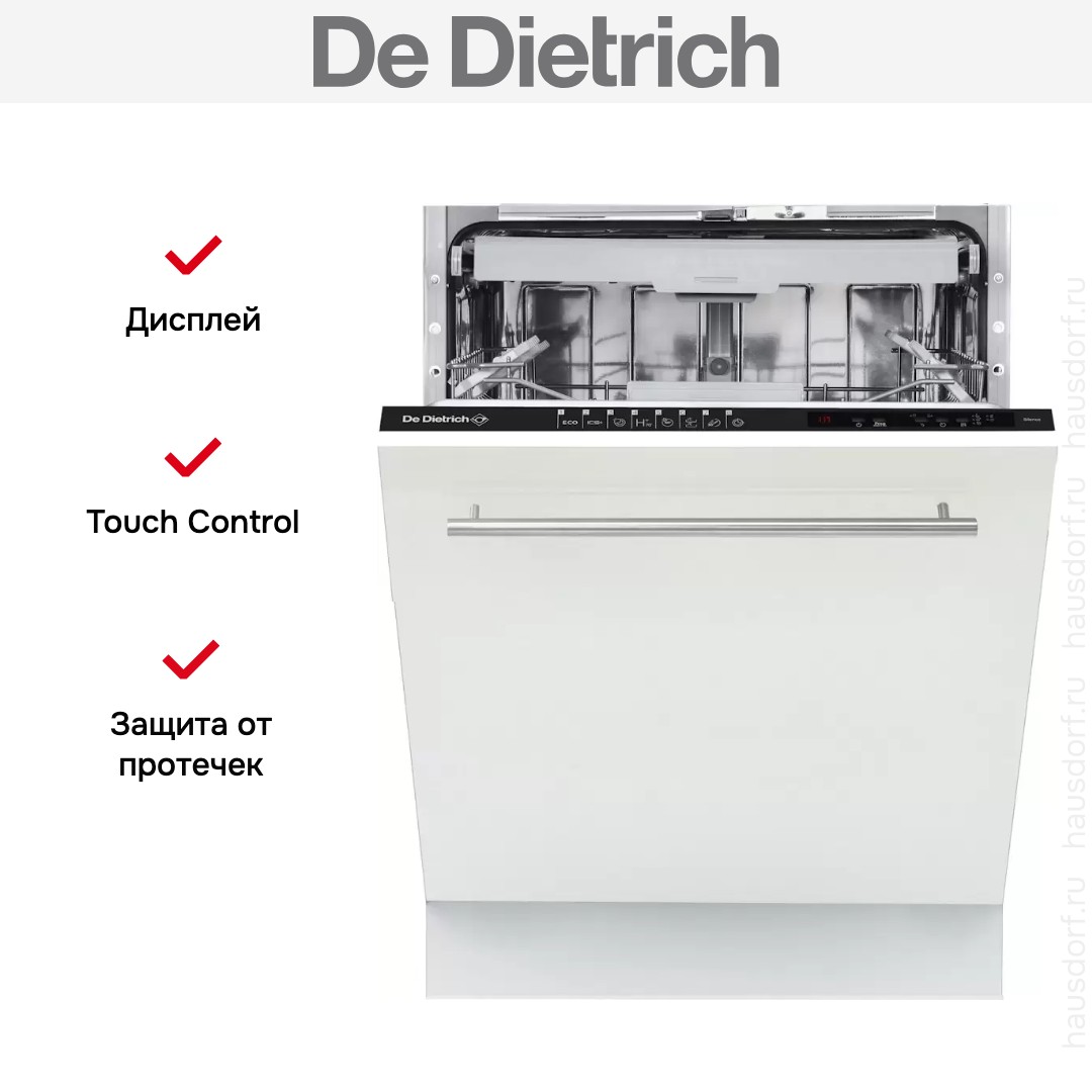 Посудомоечная машина De Dietrich DV1434QJ создана для полного встраивания в кухонный гарнитур и сохраняет единый стиль с фасадами. Ее лаконичный внешний вид позволяет скрыть технику за вашей дверцей, а черная панель управления остается незаметной благодаря закрытой конструкции. Габариты адаптированы к стандартным нишам 82×60×58 см, что упрощает монтаж в типовой кухонный модуль. Высота регулируется в пределах 81.8-86.8 см, а компактная глубина 55 см экономит пространство, не жертвуя вместимостью.