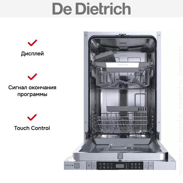 Встраиваемая модель Де Дитрих отлично впишется в любой интерьер, главное — правильно выбрать место, чтобы подвести коммуникации. Устанавливается в нишу целиком, полностью закрывается декоративной панелью. Обратите внимание: в комплекте не идет фасад, его необходимо установить самостоятельно. Имеет уменьшенную ширину — благодаря этому поместится даже на очень маленькой кухне. В камеру можно загрузить ограниченное число комплектов: 10 шт. Комплектом считается набор посуды на одного человека, который нужен для полноценного приема пищи: глубокая и плоская тарелки, тарелка для салата, блюдце под чашку, сама чашка, ложка и вилка.