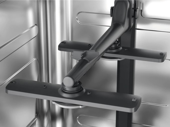 Как известно, принцип работы посудомоечной машины состоит в том, что на посуду в корзинах воздействуют сильные струи воды, которые подаются сквозь специальные форсунки во вращающихся разбрызгивателях-коромыслах. Класс мытья определяется, исходя из количества разбрызгивателей и форсунок, а также их диаметра — чем больше отверстий и чем меньше их диаметр, тем выше класс. Имеет значение также и расположение отверстий, так как струи воды не должны пересекаться — это мешает точности попадания в нужные места, а значит, и эффективности мытья. Кроме того, в камере не должно оставаться «слепых» зон, куда вода попадать не будет.