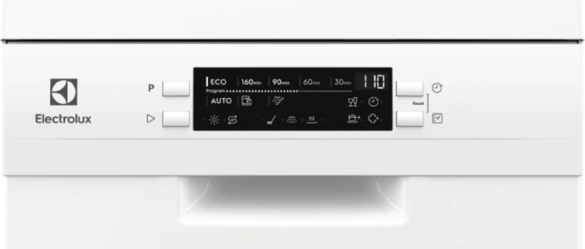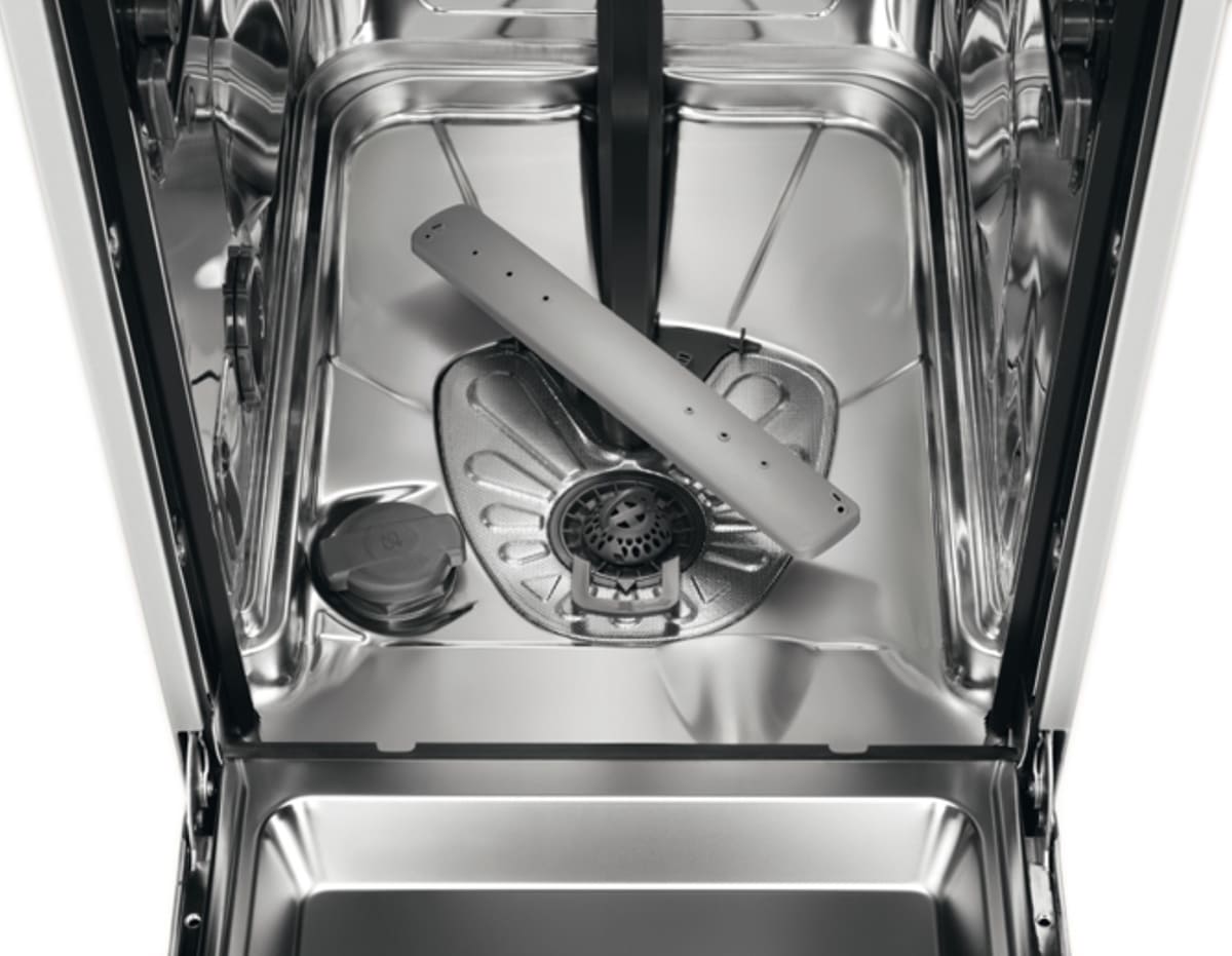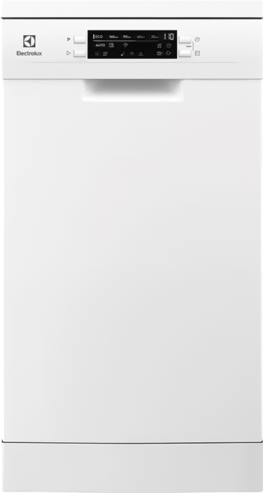 Отдельностоящая модель Электролюкс отлично впишется в кухонный интерьер, главное — правильно выбрать место, чтобы подвести коммуникации. Имеет уменьшенную ширину — благодаря этому поместится даже на очень маленькой кухне. В камеру можно загрузить ограниченное число комплектов: 9 шт. Комплектом считается набор посуды на одного человека, который нужен для полноценного приема пищи: глубокая и плоская тарелки, тарелка для салата, блюдце под чашку, сама чашка, ложка и вилка.