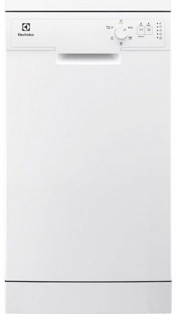 Отдельностоящая модель Электролюкс отлично впишется в кухонный интерьер, главное — правильно выбрать место, чтобы подвести коммуникации. Имеет уменьшенную ширину — благодаря этому поместится даже на очень маленькой кухне. В камеру можно загрузить ограниченное число комплектов: 9 шт. Комплектом считается набор посуды на одного человека, который нужен для полноценного приема пищи: глубокая и плоская тарелки, тарелка для салата, блюдце под чашку, сама чашка, ложка и вилка.