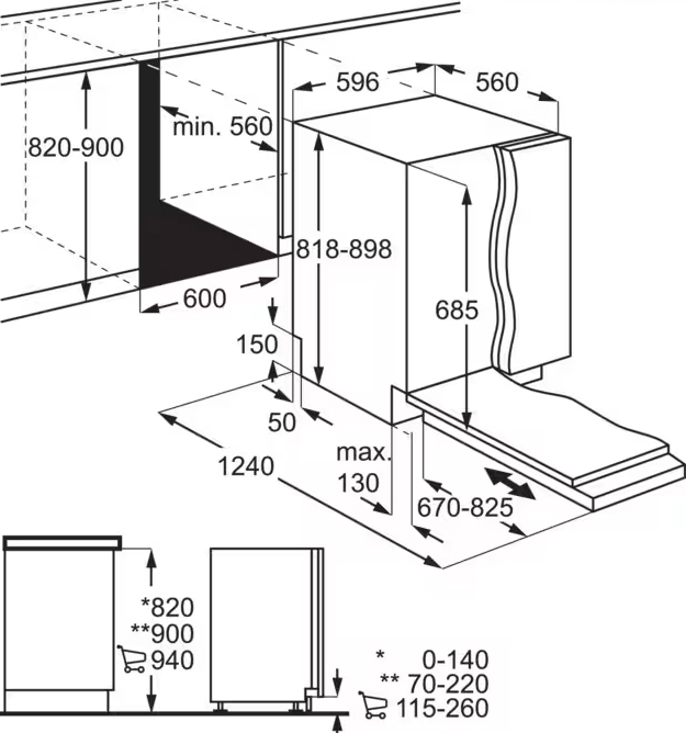 Большая часть полноразмерных и узких посудомоек встраиваемого и отдельностоящего вида имеет высоту около 82-85 см: такие модели легко размещаются под столешницей. Встраиваемые модели несколько ниже, так как у них отсутствует верхняя крышка.