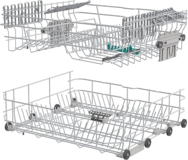 Верхняя корзина может регулироваться по высоте, так что при необходимости в нее можно поместить тарелки большего размера. Нижняя корзина позволяет установить вертикально большие суповые тарелки и блюда большого диаметра — для этого верхнюю корзину можно поднять выше. Тарелки обычно устанавливаются в откидные рамки-держатели, которые легко складываются на дно корзины. Всю посуду в нижней корзине рекомендуется устанавливать без соприкосновения предметов друг с другом, углублением к центру для более интенсивного воздействия струй воды на внутреннюю часть посуды.