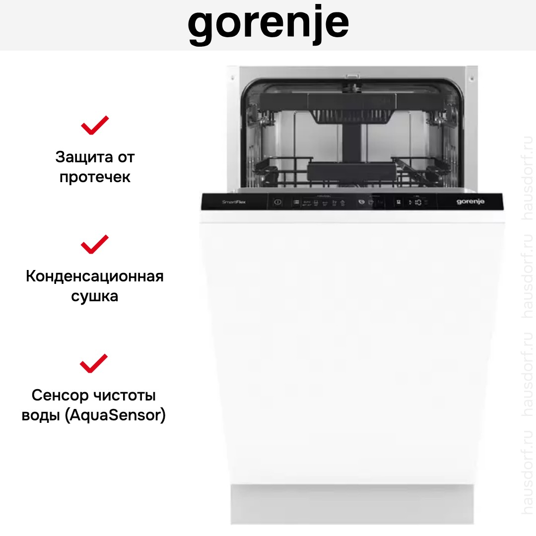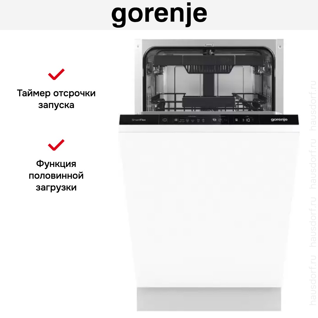 Посудомоечная машина Gorenje GV561D10 представляет собой узкую полностью встраиваемую модель, созданную для компактных кухонь. Ее аккуратные габариты 81.5×44.8×55 см позволяют разместить технику в нише 82×45×58 см без лишних зазоров. Встраиваемая конструкция под фасад делает фронтальную часть незаметной и вписывает прибор в любой стиль интерьера. Черная панель управления выгодно контрастирует с фасадом и обеспечивает четкость индикации при любом освещении.