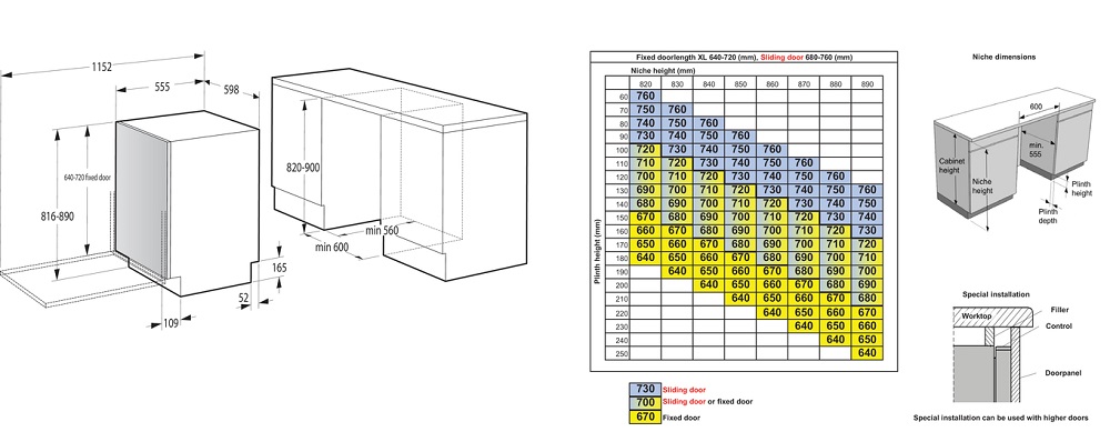 Встраиваемые устройства устанавливаются в тумбу или нишу мебельного гарнитура. В случае, если они полностью закрыты мебельным фасадом, машины считаются полностью встраиваемыми. Такое размещение позволяет сохранить единый стиль интерьера. Панель управления их также скрыта — чтобы начать работу и задать программу, дверцу придется открыть.