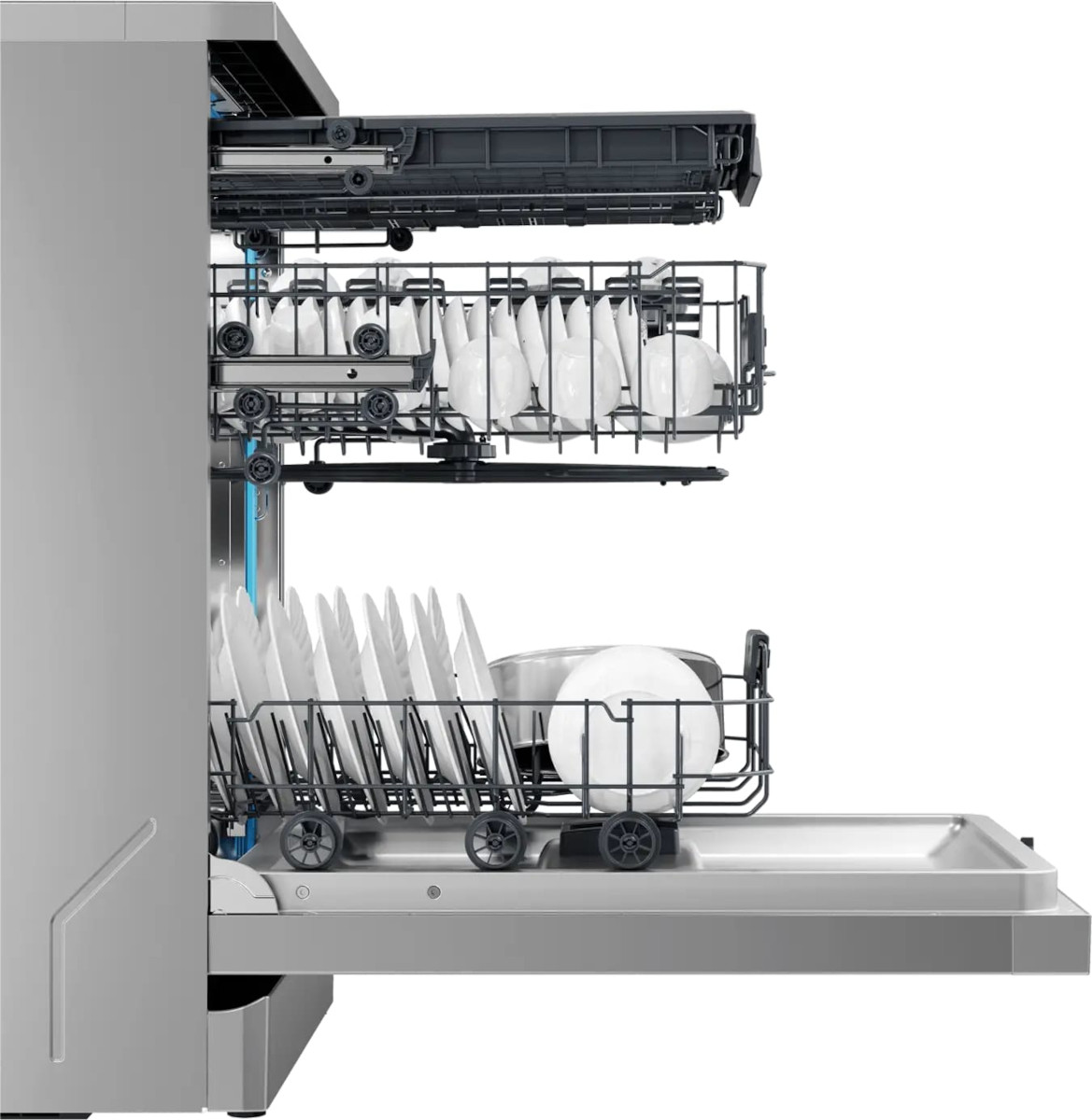 Полноразмерные модели выбирают в больших семьях, а также те, кто много готовит или часто принимает гостей. Их вместимость может составить до 15 комплектов посуды, а габаритные размеры соответствуют размерам стандартной кухонной мебели шириной и глубиной 60 см и высотой 82-85 см. Они выпускаются как во встраиваемом, так и в отдельностоящем варианте: во втором случае для установки понадобится достаточно много места. Как правило, полноразмерные приборы отличаются большим набором стандартных и специальных программ мойки, а также дополнительных опций: в частности, они оснащаются третьей корзиной для мытья столовых приборов.