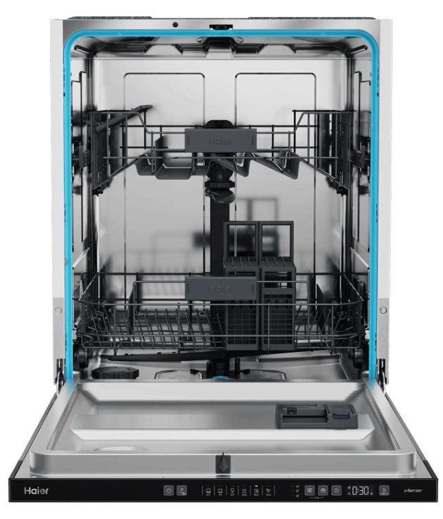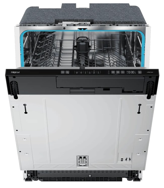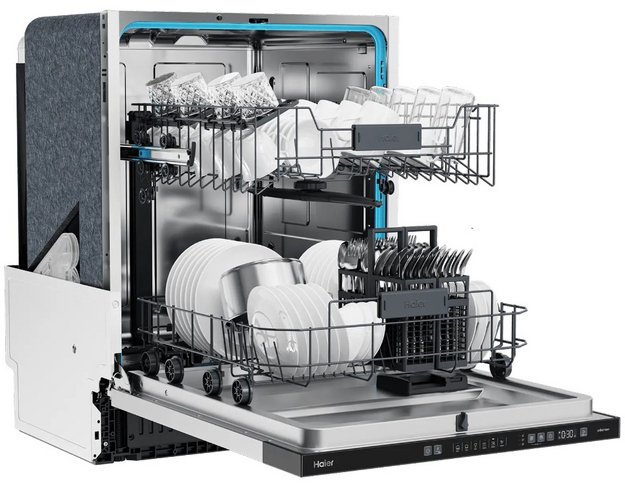 Встраиваемая модель Хайер отлично впишется в любой интерьер, главное — правильно выбрать место, чтобы подвести коммуникации. Устанавливается в нишу целиком, полностью закрывается декоративной панелью. Имеет стандартные размеры, поэтому может не поместиться на очень маленькой кухне. В камеру можно загрузить ограниченное число комплектов: 14 шт. Комплектом считается набор посуды на одного человека, который нужен для полноценного приема пищи: глубокая и плоская тарелки, тарелка для салата, блюдце под чашку, сама чашка, ложка и вилка.