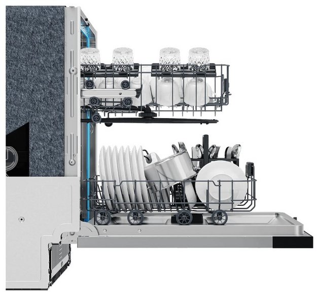 Полноразмерные модели выбирают в больших семьях, а также те, кто много готовит или часто принимает гостей. Их вместимость может составить до 15 комплектов посуды, а габаритные размеры соответствуют размерам стандартной кухонной мебели шириной и глубиной 60 см и высотой 82-85 см. Они выпускаются как во встраиваемом, так и в отдельностоящем варианте: во втором случае для установки понадобится достаточно много места. Как правило, полноразмерные приборы отличаются большим набором стандартных и специальных программ мойки, а также дополнительных опций: в частности, они оснащаются третьей корзиной для мытья столовых приборов.