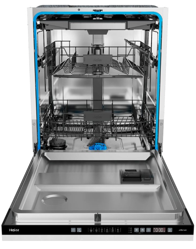 Встраиваемая модель Хайер отлично впишется в любой интерьер, главное — правильно выбрать место, чтобы подвести коммуникации. Устанавливается в нишу целиком, полностью закрывается декоративной панелью. Обратите внимание: в комплекте не идет фасад, его необходимо установить самостоятельно. Имеет стандартные размеры, поэтому может не поместиться на очень маленькой кухне. В камеру можно загрузить ограниченное число комплектов: 14 шт. Комплектом считается набор посуды на одного человека, который нужен для полноценного приема пищи: глубокая и плоская тарелки, тарелка для салата, блюдце под чашку, сама чашка, ложка и вилка.