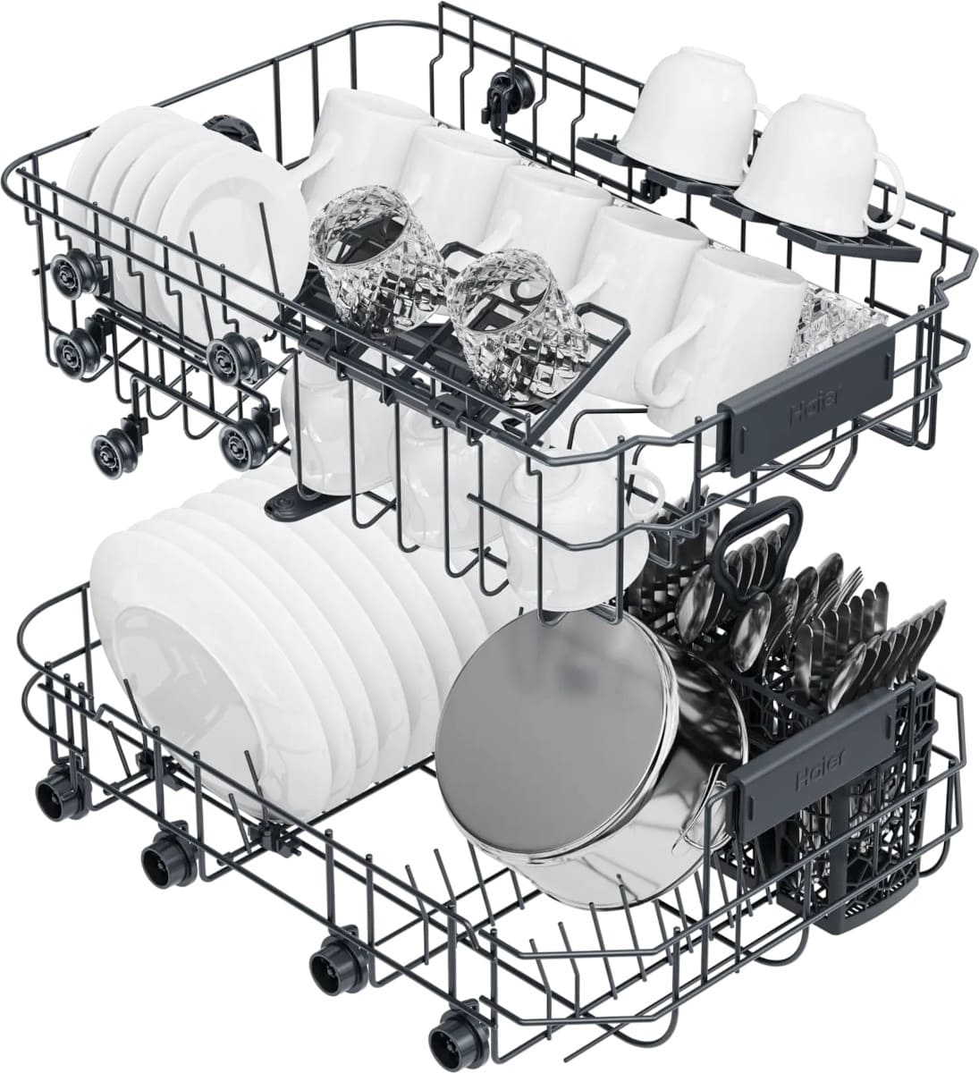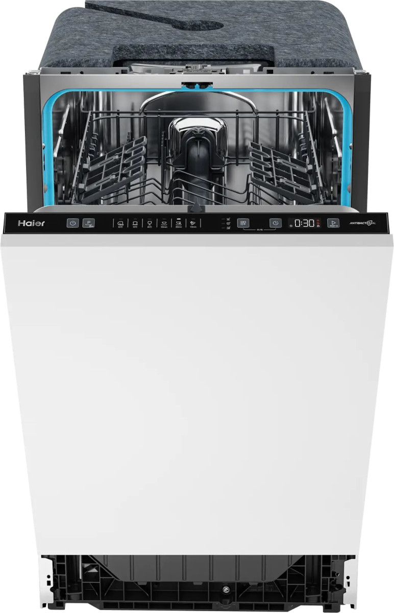 Встраиваемая модель Хайер отлично впишется в любой интерьер, главное — правильно выбрать место, чтобы подвести коммуникации. Устанавливается в нишу целиком, полностью закрывается декоративной панелью. Обратите внимание: в комплекте не идет фасад, его необходимо установить самостоятельно. Имеет уменьшенную ширину — благодаря этому поместится даже на очень маленькой кухне. В камеру можно загрузить ограниченное число комплектов: 9 шт. Комплектом считается набор посуды на одного человека, который нужен для полноценного приема пищи: глубокая и плоская тарелки, тарелка для салата, блюдце под чашку, сама чашка, ложка и вилка.