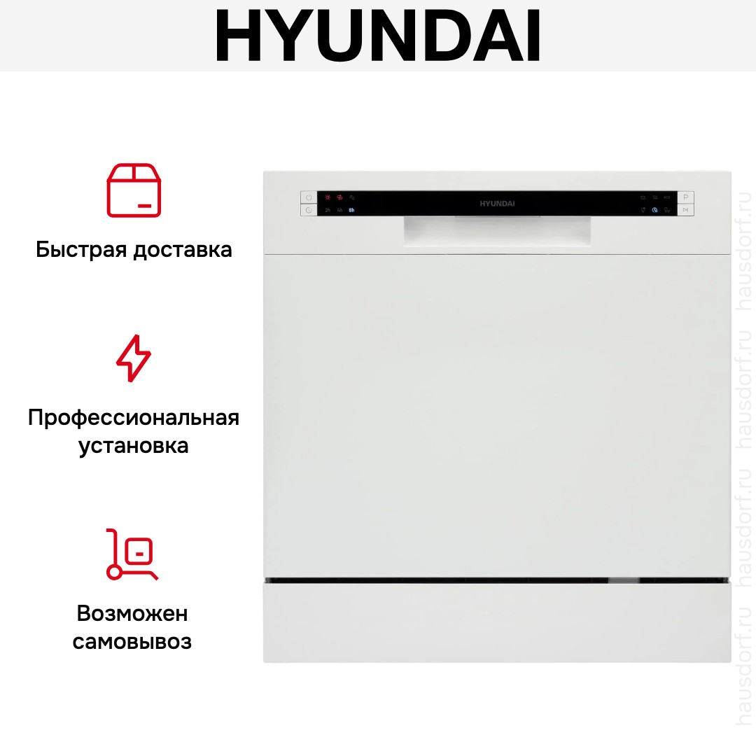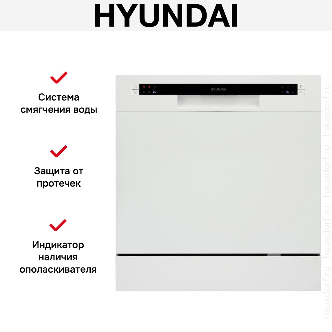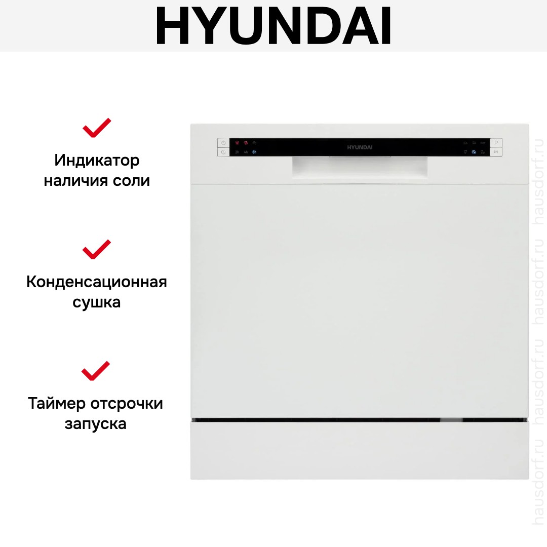 Отдельностоящая модель Хендай отлично впишется в кухонный интерьер, главное — правильно выбрать место, чтобы подвести коммуникации. Компактные размеры позволяют разместить ее даже на очень маленькой кухне. В камеру можно загрузить ограниченное число комплектов: 8 шт. Комплектом считается набор посуды на одного человека, который нужен для полноценного приема пищи: глубокая и плоская тарелки, тарелка для салата, блюдце под чашку, сама чашка, ложка и вилка.
