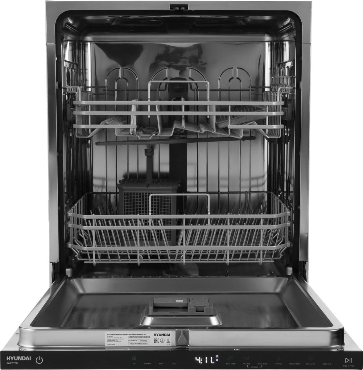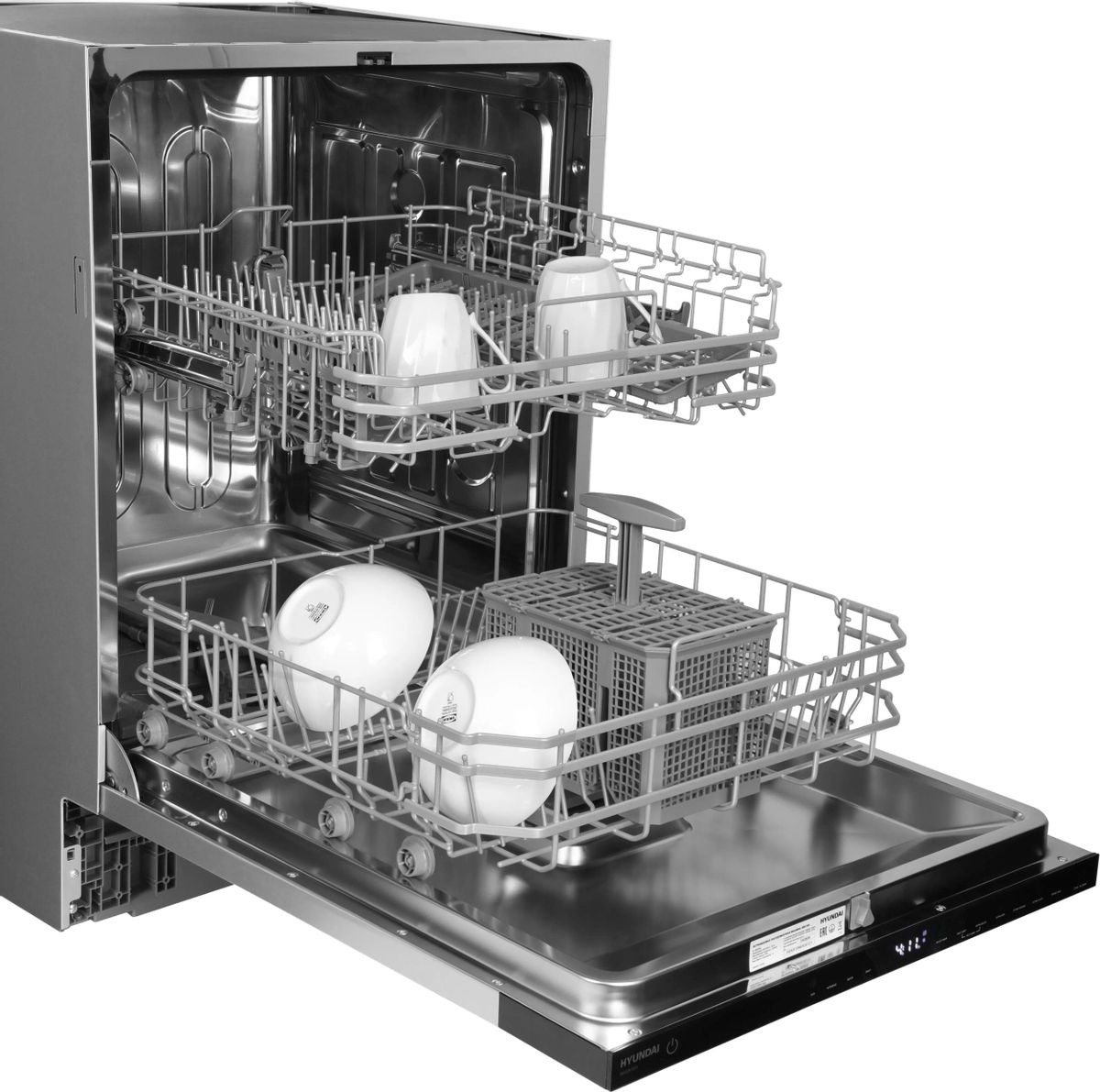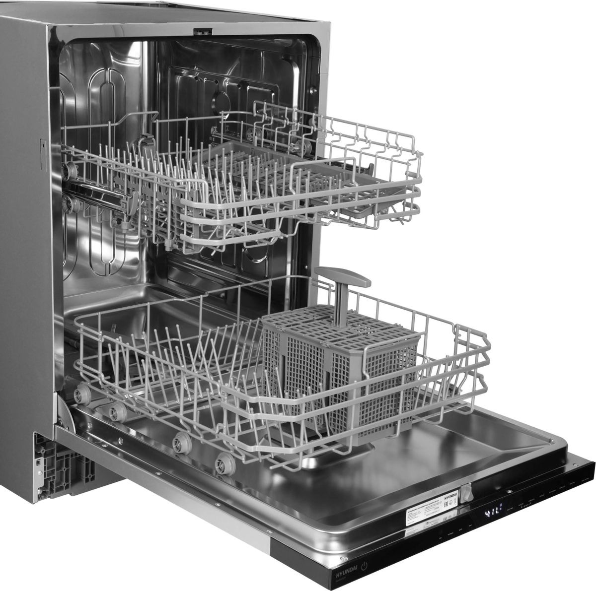 Встраиваемая модель Хендай отлично впишется в любой интерьер, главное — правильно выбрать место, чтобы подвести коммуникации. Устанавливается в нишу целиком, полностью закрывается декоративной панелью. Имеет стандартные размеры, поэтому может не поместиться на очень маленькой кухне. В камеру можно загрузить ограниченное число комплектов: 13 шт. Комплектом считается набор посуды на одного человека, который нужен для полноценного приема пищи: глубокая и плоская тарелки, тарелка для салата, блюдце под чашку, сама чашка, ложка и вилка.