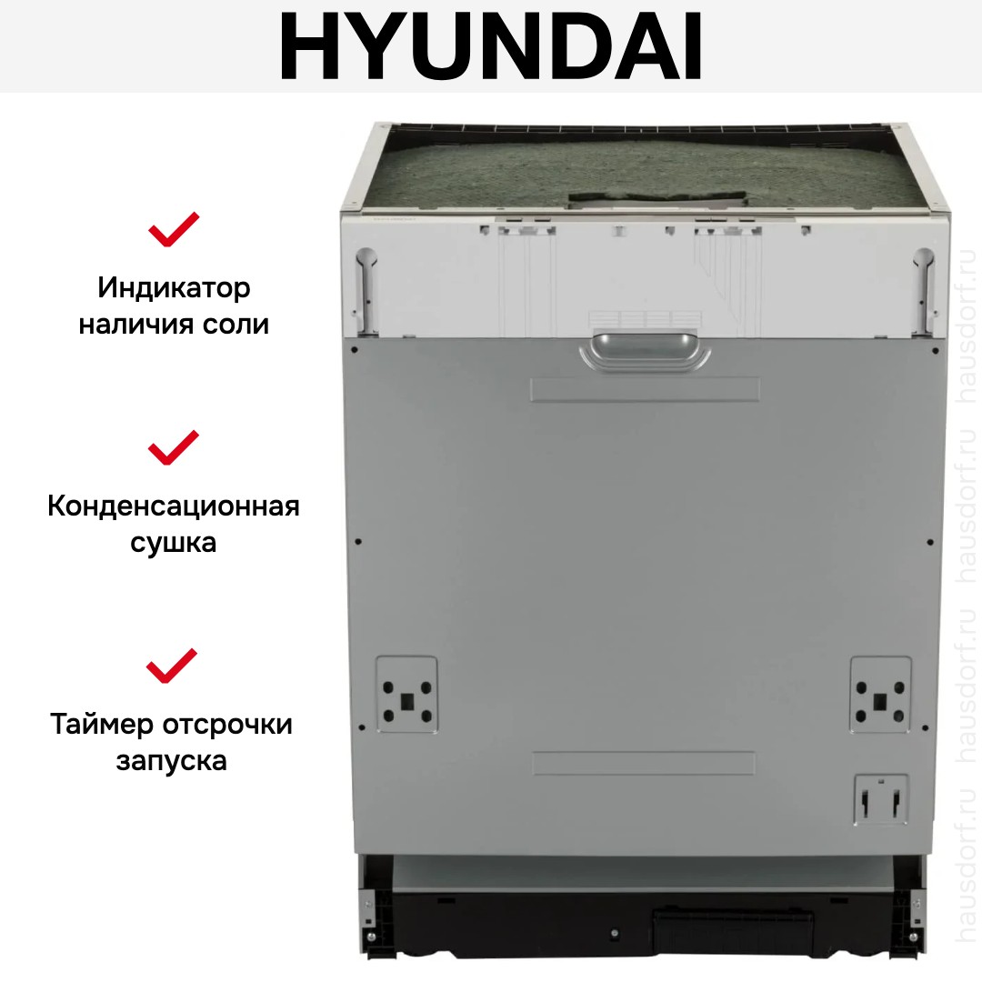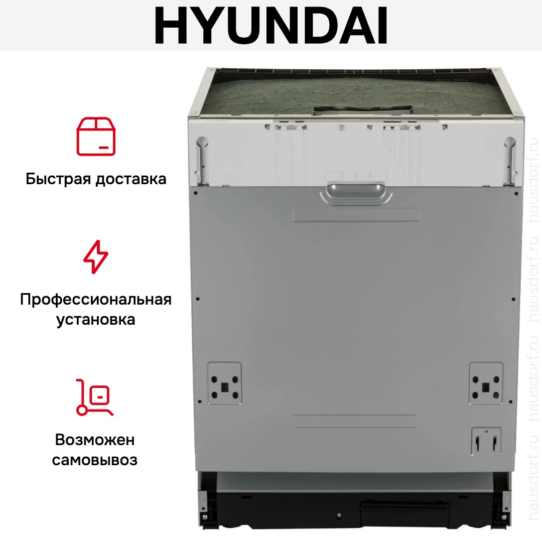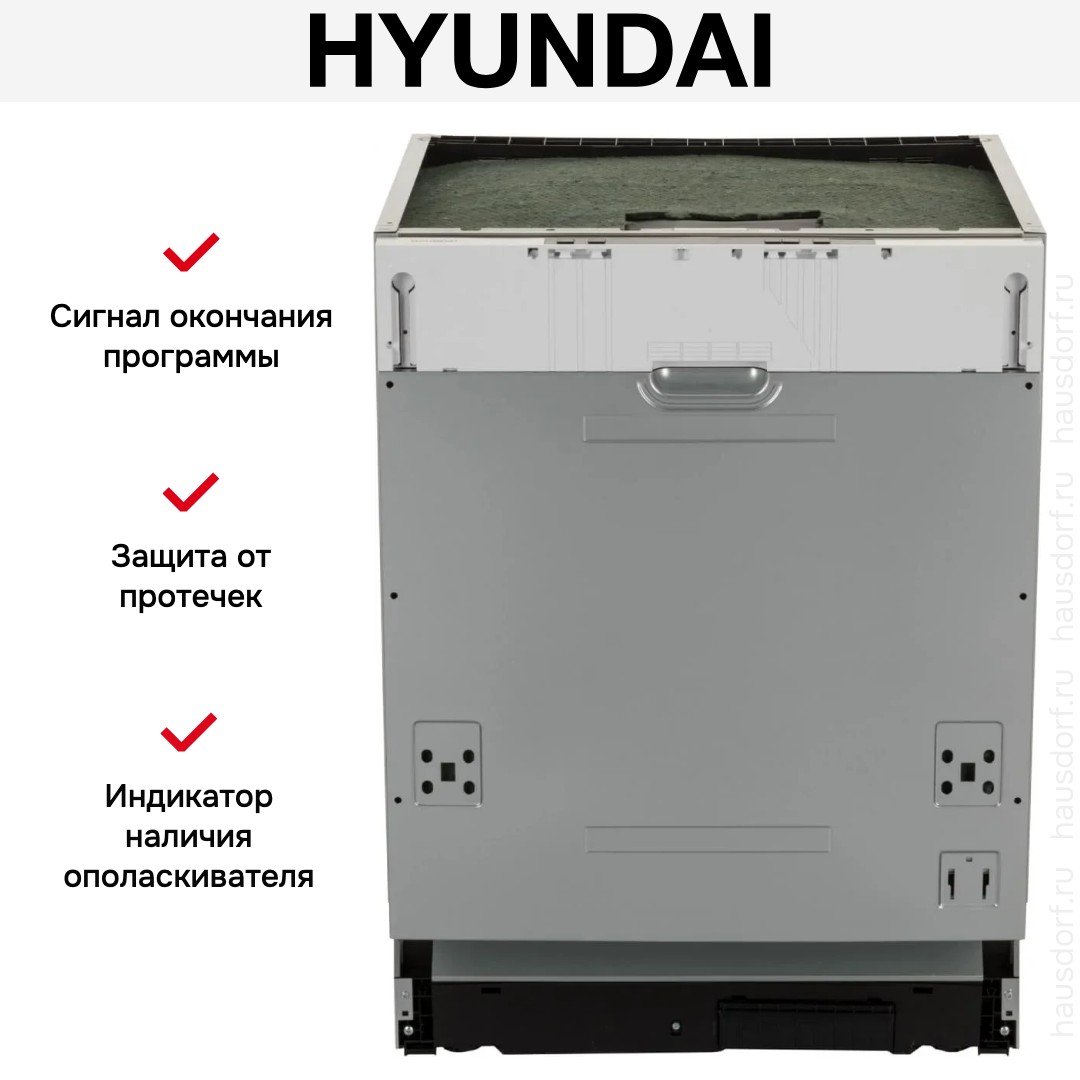 Встраиваемая модель Хендай отлично впишется в любой интерьер, главное — правильно выбрать место, чтобы подвести коммуникации. Устанавливается в нишу целиком, полностью закрывается декоративной панелью. Обратите внимание: в комплекте не идет фасад, его необходимо установить самостоятельно. Имеет стандартные размеры, поэтому может не поместиться на очень маленькой кухне. В камеру можно загрузить ограниченное число комплектов: 12 шт. Комплектом считается набор посуды на одного человека, который нужен для полноценного приема пищи: глубокая и плоская тарелки, тарелка для салата, блюдце под чашку, сама чашка, ложка и вилка.