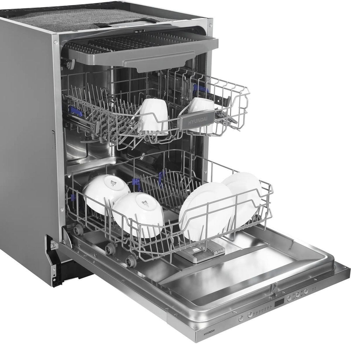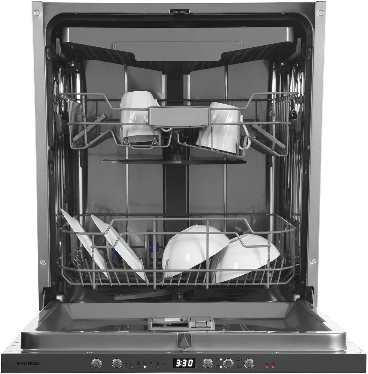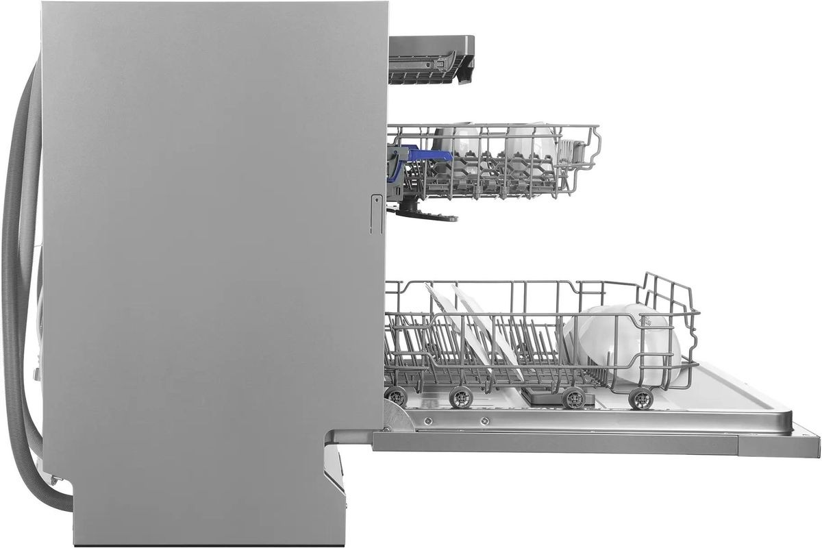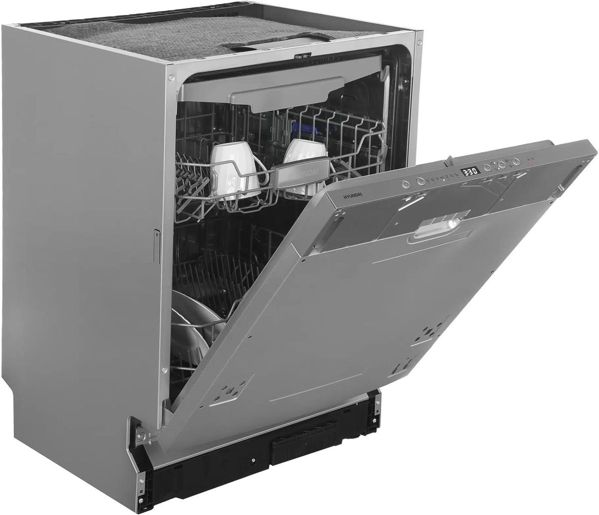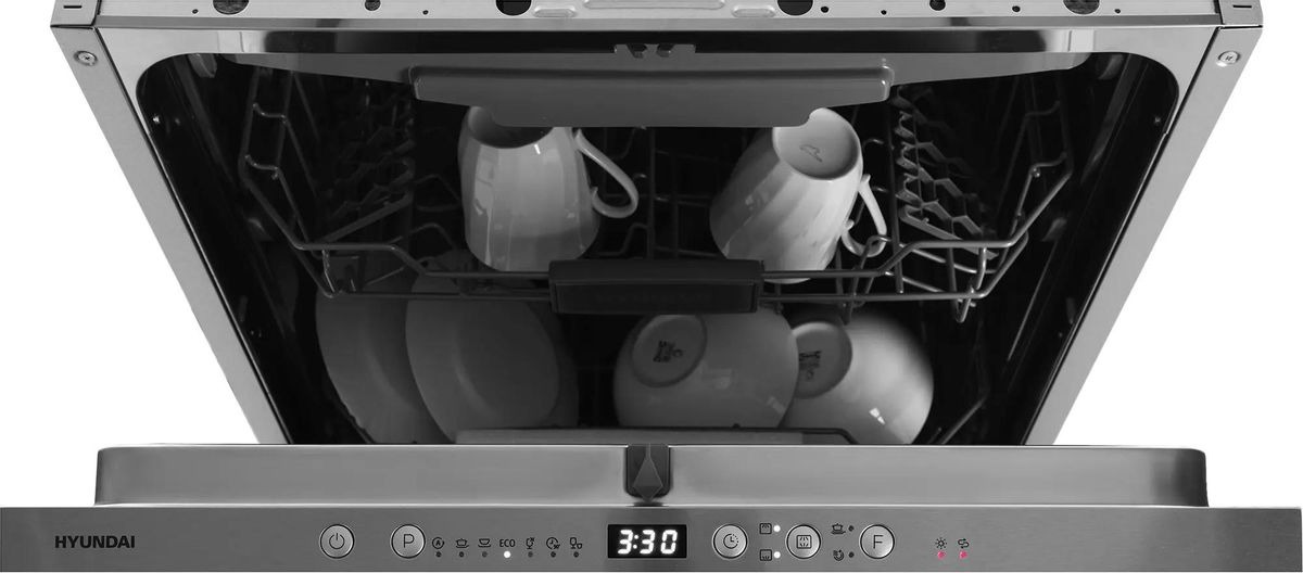 Встраиваемая модель Хендай отлично впишется в любой интерьер, главное — правильно выбрать место, чтобы подвести коммуникации. Устанавливается в нишу целиком, полностью закрывается декоративной панелью. Обратите внимание: в комплекте не идет фасад, его необходимо установить самостоятельно. Имеет стандартные размеры, поэтому может не поместиться на очень маленькой кухне. В камеру можно загрузить ограниченное число комплектов: 14 шт. Комплектом считается набор посуды на одного человека, который нужен для полноценного приема пищи: глубокая и плоская тарелки, тарелка для салата, блюдце под чашку, сама чашка, ложка и вилка.