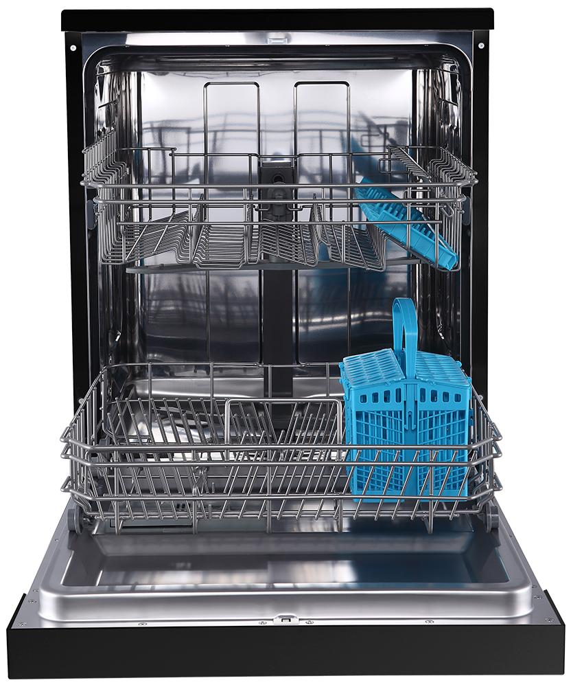 Полноразмерная посудомоечная машина устанавливается отдельно — за счет насыщенного черного цвета она может стать стилеобразующим акцентом на вашей кухне. В камеру помещается до 14 стандартных комплектов посуды, при этом можно использовать режим половинной загрузки, если не хочется копить тарелки и чашки.