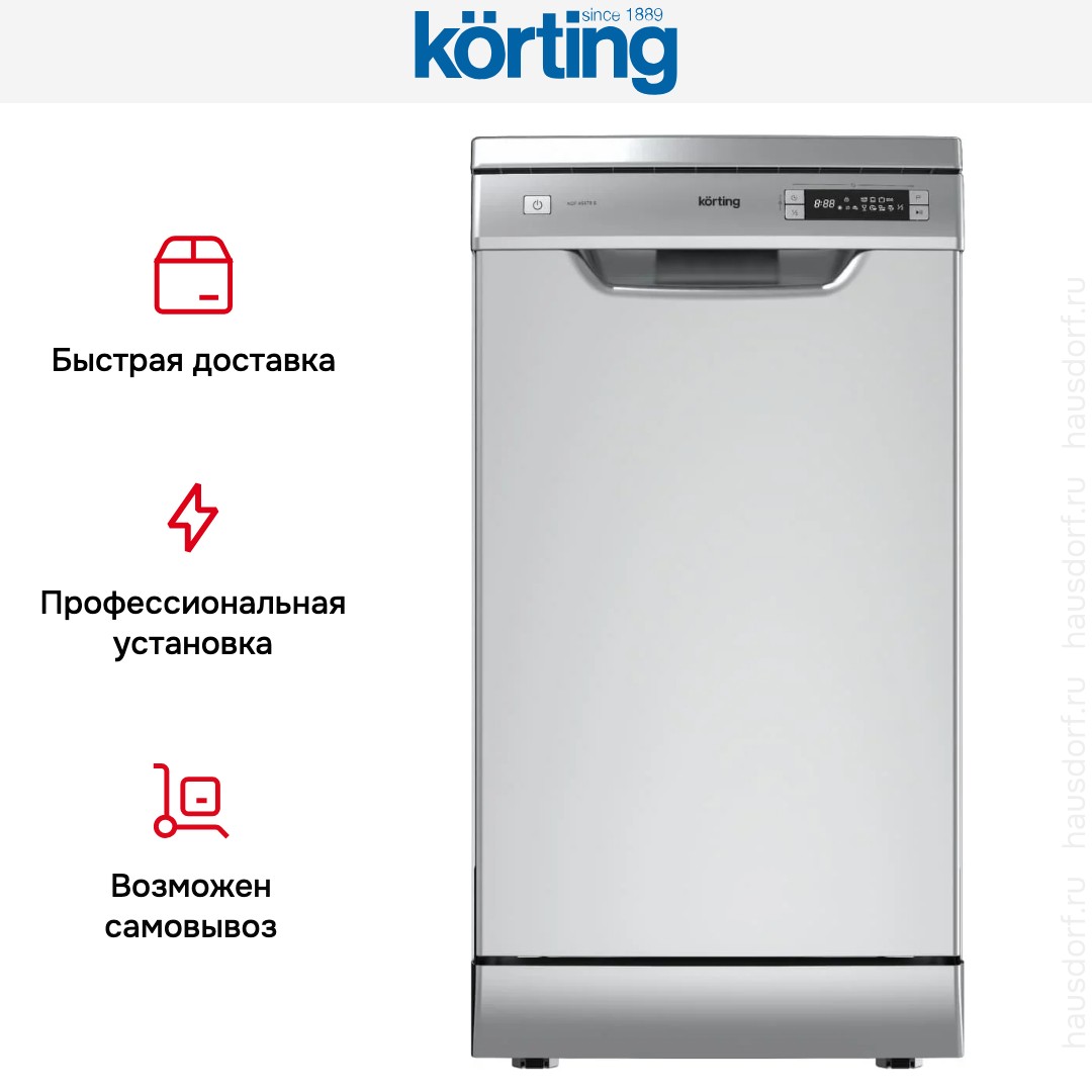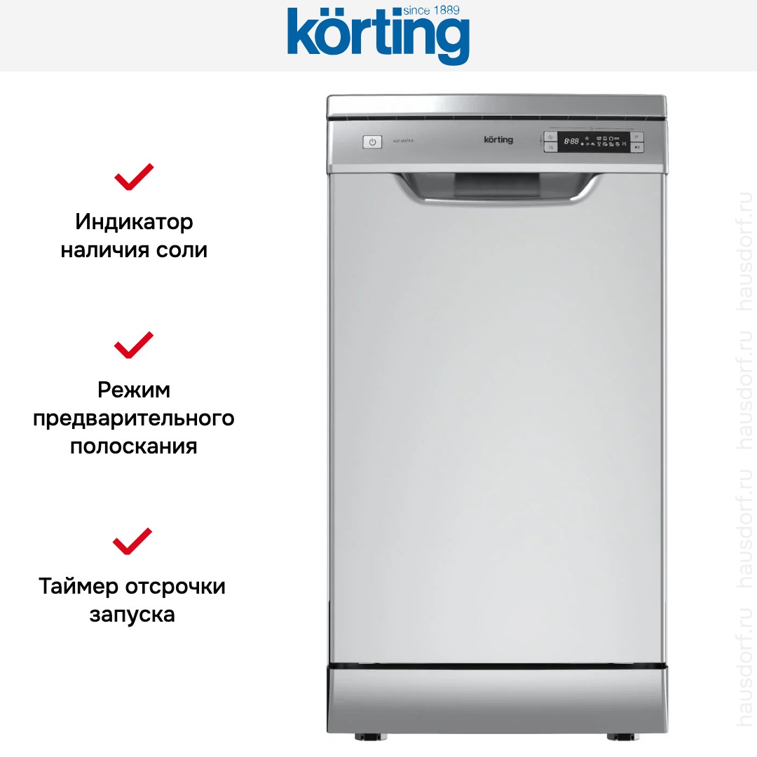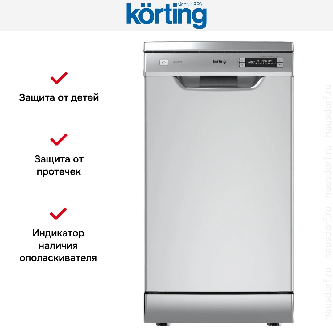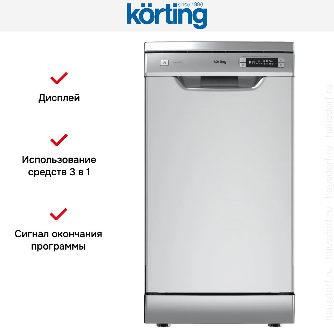 Посудомоечная машина Korting KDF 45678 S представляет собой узкую отдельно стоящую модель с элегантным серебристым корпусом и открытой панелью управления, которая гармонично впишется в современную кухню и не займет много места. Дизайн выполнен с упором на практичность, а компактные габариты 84.5×44.8×60 см делают прибор идеальным решением для семьи из 1-3 человек.